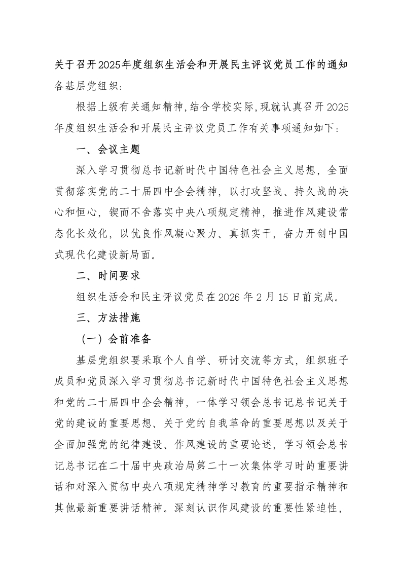 关于召开2025年度组织生活会和开展民主评议党员工作的通知各基层党组织:根据上级有关通知精神,结合学校实际,现就认真召开2025年度组织生活会和开展民主评议党员工作有关事项通知如下:一、会议主题深入学习贯彻总书记新时代中国特色社会主义思想,全面贯彻落实党的二十届四中全会精神,以打攻坚战、持久战的决心和恒心,锲而不舍落实中央八项规定精神,推进作风建设常态化长效化,以优良作风凝心聚力、真抓实干,奋力开创中国式现代化建设新局面。二、时间要求组织生活会和民主评议党员在2026年2月15日前完成。三、方法措施(一)会前准备基层党组织要采取个人自学、研讨交流等方式,组织班子成员和党员深入学习贯彻总书记新时代中国特色社会主义思想和党的二十届四中全会精神,一体学习领会总书记总书记关于党的建设的重要思想、关于党的自我革命的重要思想以及关于全面加强党的纪律建设、作风建设的重要论述,学习领会总书记总书记在二十届中央政治局第二十一次集体学习时的重要讲话和对深入贯彻中央八项规定精神学习教育的重要指示精神和其他最新重要讲话精神。深刻认识作风建设的重要性紧迫性,切实增强开好会议的思想自觉和行动自觉。(二)查摆问题深入开展谈心谈话,广泛征求意见建议,真听意见、听真意见,统筹兼顾党内党外和不同层次,特别是普通党员、普通群众意见建议,对征求到的意见要尊重原意,原汁原味反馈。基层党组织和党员要紧紧围绕会议主题,把开展深入贯彻中央八项规定精神学习教育情况作为对照检查的重要内容。基层党支部要从加强理论武装、执行上级组织决定、严格组织生活、加强党员管理监督、做好群众工作、抓好自身建设等方面进行对照检查;党员要从学习贯彻党的创新理论、加强党性锤炼、联系服务群众、发挥先锋模范作用、改作风树新风等方面查找差距不足。基层党组织班子对照检查材料和党员个人发言提纲要开门见山、直奔主题,内容完整、言之有物。个人发言提纲不得抄袭、使用人工智能工具撰写、让他人代写,不得拿以往发言提纲拼凑应付。会上,要通报2025年XX巡察整改问题整治落实情况、2024年度组织生活会整改落实情况。典型案例剖析,以案说德、以案说纪、以案说法、以案说责。典型案例剖析的内容要在班子对照检查材料和个人发言提纲中单列一部分。(三)严肃开展批评和自我批评自我批评要正视问题、揭短亮丑,对照贯彻落实中央八项规定精神情况,重点查找自身党性问题、作风问题、遵规守纪