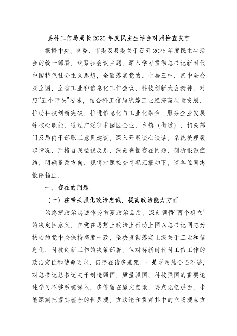 县科工信局局长2025年度民主生活会对照检查发言根据中央、省委、市委及县委关于召开2025年度民主生活会的统一部署,我紧扣会议主题,深入学习贯彻总书记新时代中国特色社会主义思想,全面落实党的二十届三中、四中全会及全国、全省工业和信息化工作会议、科技创新大会精神,对照“五个带头”要求,结合科工信局统筹工业经济高质量发展、推动科技创新突破、推进信息化与工业化融合、服务企业发展等核心职能,通过广泛征求园区企业、乡镇(街道)、相关部门及局内干部职工意见建议,深入开展谈心谈话,系统梳理履职情况,严格自我检视反思,深刻查摆存在问题、剖析根源症结、明确整改方向。现将对照检查情况汇报如下,请各位同志批评指正。一、存在的问题(一)在带头强化政治忠诚、提高政治能力方面始终把政治忠诚作为首要政治品质,深刻领悟“两个确立”的决定性意义,自觉在思想上政治上行动上同以总书记同志为核心的党中央保持高度一致,坚决贯彻落实上级关于工业和信息化、科技创新工作的决策部署,但对标新时代科工信工作的政治定位和使命要求,仍存在诸多差距。一是学用结合还不够,对总书记总书记关于制造强国、质量强国、科技强国的重要论述学习不够系统深入,多停留在原文宣读、要点记忆层面,未能深刻把握其蕴含的世界观、方法论和贯穿其中的立场观点方法,在将理论学习成果转化为推动县域工业转型升级、科技创新突破的具体思路和务实举措上思考不深、谋划不细。例如,在贯彻落实“推动传统产业高端化、智能化、绿色化转型”的重要指示精神时,仅简单围绕上级下达的技改补贴指标开展工作,未能结合我县装备制造、农产品加工等主导产业的实际短板,制定差异化、精准化的转型实施方案,导致部分企业技改方向不明确、成效不明显。二是前瞻性预判不足,面对国内外宏观经济形势复杂变化、产业链供应链波动、科技创新迭代加速等新形势,对县域工业经济运行中的潜在风险研判不够精准、应对不够主动,缺乏系统性风险评估和极端情况应对预案。如2025年下半年,受上游原材料价格大幅上涨和下游市场需求萎缩双重影响,我县装备制造行业多家企业出现生产经营困难,但此前未能提前预判并建立预警机制,直到企业反映问题后才仓促应对,错失了主动帮扶的最佳时机。三是执行落实有差距,在推动上级决策部署落地见效过程中,存在“重部署、轻落细、弱问效”的现象,对政策执行过程中的堵点、难点问题排查不及时、解决不彻底。例如,在落实国家关于“专精特新”中小企业培育的扶持政策时,虽然召开了政策宣讲会、印发了宣传手册,但对企业申报过程中遇到的知识产权认定、研发费用归集等具体难题,未能组织专业力量开展“一对一”精准指导,导致我县2025年“专精特新”中小企业申报通过率低于全市平均水平,政策红利未能充分释放。四是安全底线意识不强,对工业领域安全生