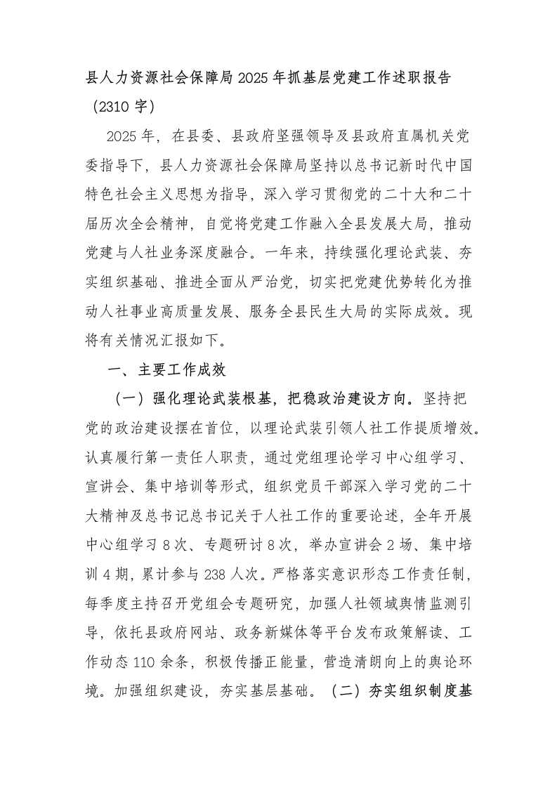 县人力资源社会保障局2025年抓基层党建工作述职报告(2310字)2025年,在县委、县政府坚强领导及县政府直属机关党委指导下,县人力资源社会保障局坚持以总书记新时代中国特色社会主义思想为指导,深入学习贯彻党的二十大和二十届历次全会精神,自觉将党建工作融入全县发展大局,推动党建与人社业务深度融合。一年来,持续强化理论武装、夯实组织基础、推进全面从严治党,切实把党建优势转化为推动人社事业高质量发展、服务全县民生大局的实际成效。现将有关情况汇报如下。一、主要工作成效(一)强化理论武装根基,把稳政治建设方向。坚持把党的政治建设摆在首位,以理论武装引领人社工作提质增效。认真履行第一责任人职责,通过党组理论学习中心组学习、宣讲会、集中培训等形式,组织党员干部深入学习党的二十大精神及总书记总书记关于人社工作的重要论述,全年开展中心组学习8次、专题研讨8次,举办宣讲会2场、集中培训4期,累计参与238人次。严格落实意识形态工作责任制,每季度主持召开党组会专题研究,加强人社领域舆情监测引导,依托县政府网站、政务新媒体等平台发布政策解读、工作动态110余条,积极传播正能量,营造清朗向上的舆论环境。加强组织建设,夯实基层基础。(二)夯实组织制度基础,建强基层战斗堡垒。带头落实“三会一课”、主题党日、组织生活会等制度,各党支部全年召开党员大会46次、支委会56次、党课14次,开展主题党日39次,党内政治生活规范严肃。严格党员发展程序,全年发展党员1名。加强党员教育培训,组织党组织书记参加县级以上脱产培训3天,全体党员参与党校及机关培训6期、覆盖160人次,举办党务工作者培训3次;围绕党的二十届四中全会精神开展专题党课和研讨交流8次,推动理论学习成果转化为人社工作的实际能力。(三)聚焦党建引领业务,服务民生发展大局。坚持党建与业务融合,推动人社工作取得新进展。一是就业创业服务扎实推进。积极向上争取资金与项目支持,于2025年12月成功申报省级就业公共服务能力提升示范项目,总投资1200万元。全年组织党员干部深入基层开展招聘活动25场,动员70余家企业提供岗位约600个,达成就业意向612人,实现城镇新增就业2851人。开展“粤菜师傅”培训442人次、“南粤家政”培训305人次、X云吞技能培训154人次,精准帮扶53名重点群体实现就业。二是党建品牌建设成效显著。打造“服务升温产业生金一X云吞‘小支点'撬动富民大梦想”党建项目,先后荣获县第三届“竹乡杯”工作创新大赛一等奖、第四届市“西江杯”工作创新大赛三等奖。2025年10月,在X区成功举办X县第二届云吞美食文化推介会,创新采用“地