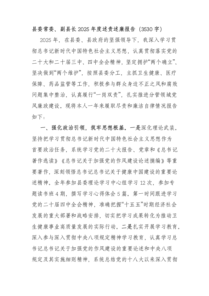 县委常委、副县长2025年度述责述廉报告(3530字)2025年,在县委、县政府的坚强领导下,我深入学习贯彻总书记新时代中国特色社会主义思想,认真贯彻落实党的二十大和二十届三中、四中全会精神,坚定拥护“两个确立”、坚决做到“两个维护”,按照县委分工,主抓卫生健康、医疗保障、药品监管等工作,积极参与群众身边不正之风和腐败问题集中整治,认真履行“一岗双责”,扎实推进分管领域党风廉政建设。现将本人一年来履职尽责和廉洁自律情况报告如下:一、强化政治引领,筑牢思想根基。一是深化理论武装。坚持把学习贯彻总书记新时代中国特色社会主义思想作为首要政治任务,系统学习党的二十大报告、党章和《总书记著作选读》《总书记关于加强党的作风建设论述摘编》等重要著作,深刻领悟总书记总书记关于健康中国建设的重要论述精神。全年参加县委理论学习中心组学习12次,参加专题读书班4期,撰写学习心得体会5篇。第一时间跟进学习党的二十届四中全会精神,准确把握“十五五”时期经济社会发展的重大部署和战略安排,切实把学习成果转化为推动卫生健康事业高质量发展的实际行动。二是扎实开展学习教育。深入参与深入贯彻中央八项规定精神学习教育,认真学习总书记总书记关于加强党的作风建设的重要论述和中央八项规定及其实施细则精神,系统总结党的十八大以来深入贯彻中央八项规定精神取得的显著成效。对照《违反中央八项规定及其实施细则精神问题清单》,深入查摆自身和分管领域存在的问题,制定整改措施并抓好落实。观看警示教育片3部,参加专题研讨4次,切实把学习教育成果转化为改进作风、推动工作的实际行动。三是强化政治纪律和政治规矩。始终在思想上政治上行动上同以总书记同志为核心的党中央保持高度一致,严格执行重大事项请示报告制度,不折不扣贯彻落实上级决策部署。在分管工作中,坚决杜绝做选择、搞变通、打折扣,确保政令畅通、令行禁止。二、聚焦主责主业,推动事业发展。一是全力推进卫生健康事业发展。深入推进健康中国战略在我县落地落实,统筹推进医疗、医保、医药协同发展和治理。全面推广三明医改经验,以公益性为导向推进公立医院改革,推动县人民医院、县中医院医疗服务能力提升工程。深化紧密型县域医共体建设,推进优质医疗资源下沉基层,全年完成基层医疗机构标准化建设12个,新增村卫生室规范化建设15个。加强公共卫生体系建设,持续做好重点传染病防控,全面提升突发公共卫生事件应急处置能力。推进基层慢性病多病共防共管,全县高血压、糖尿病规范管理率分别达到85%、82%。二是持续深化医疗保障制度改革。全面落实医保惠民政策,推进基本医疗保险、大病保险、医疗救助“三重保障”有效衔接。深化医保支付方式改革,扩大按病种付费覆盖范围。加