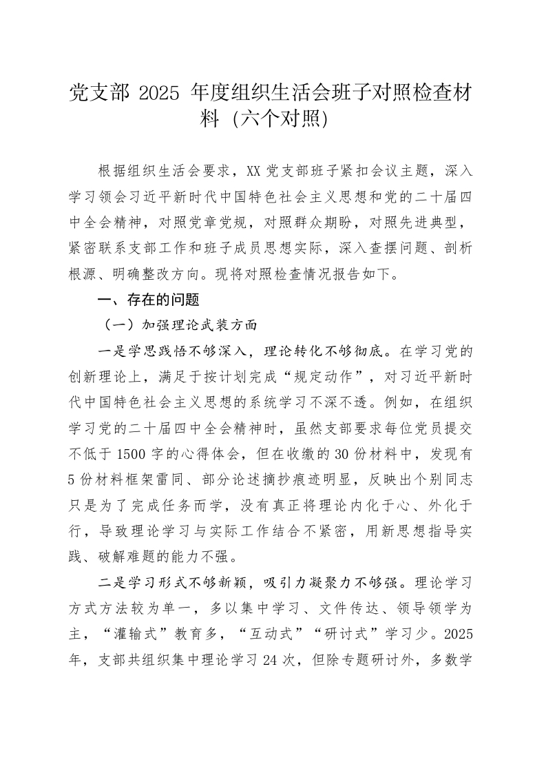 党支部2025年度组织生活会班子对照检查材料(六个对照)根据组织生活会要求,XX党支部班子紧扣会议主题,深入学习领会习近平新时代中国特色社会主义思想和党的二十届四中全会精神,对照党章党规,对照群众期盼,对照先进典型,紧密联系支部工作和班子成员思想实际,深入查摆问题、剖析根源、明确整改方向。现将对照检查情况报告如下。一、存在的问题(一)加强理论武装方面一是学思践悟不够深入,理论转化不够彻底。在学习党的创新理论上,满足于按计划完成“规定动作”,对习近平新时代中国特色社会主义思想的系统学习不深不透。例如,在组织学习党的二十届四中全会精神时,虽然支部要求每位党员提交不低于1500字的心得体会,但在收缴的30份材料中,发现有5份材料框架雷同、部分论述摘抄痕迹明显,反映出个别同志只是为了完成任务而学,没有真正将理论内化于心、外化于行,导致理论学习与实际工作结合不紧密,用新思想指导实践、破解难题的能力不强。二是学习形式不够新颖,吸引力凝聚力不够强。理论学习方式方法较为单一,多以集中学习、文件传达、领导领学为主,“灌输式”教育多,“互动式”“研讨式”学习少。2025年,支部共组织集中理论学习24次,但除专题研讨外,多数学习仍是“一人读、大家听”的模式。这种方式未能充分调动青年党员的学习热情和主动性,导致部分学习活动氛围沉闷,党员参与感不强,学习效果打了折扣,理论学习的政治功能和教育功能发挥不充分。三是督促检查不够严格,学习效果不够扎实。对党员个人自学的监督检查机制不健全,缺乏有效的考核和评估手段,对学习效果的检验多停留在检查学习笔记数量、心得体会篇数等表面功夫上。比如,在2025年第三季度的党员学习笔记抽查中,虽然30名党员笔记平均字数超过2万字,但有4名同志的笔记内容多为原文抄录,缺少个人思考和感悟,这表明支部对学习过程的监督多于对学习成果的检验,导致部分党员学习存在应付心态,学习的深度和实效不扎实。(二)执行上级组织决定方面一是政治站位不够高远,大局意识不够牢固。在贯彻落实上级决策部署时,有时存在本位主义思想,更多地从本单位、本部门的利益和实际出发,对一些需要协调配合、让渡利益的工作,思想上存在顾虑,行动上不够坚决。在2025年XX专项工作中,上级要求各单位抽调骨干力量集中攻坚,支部班子在人员选派上,考虑到部门人手紧张,未能第一时间派出最强力量,影响了整体工作进度,暴露出在局部与全局、当前与长远关系处理上的短板。二是执行标准不够严苛,攻坚克难不够坚决。在执行上级部署的任务时,存在“只求过得去,不求过得硬”的倾向,满