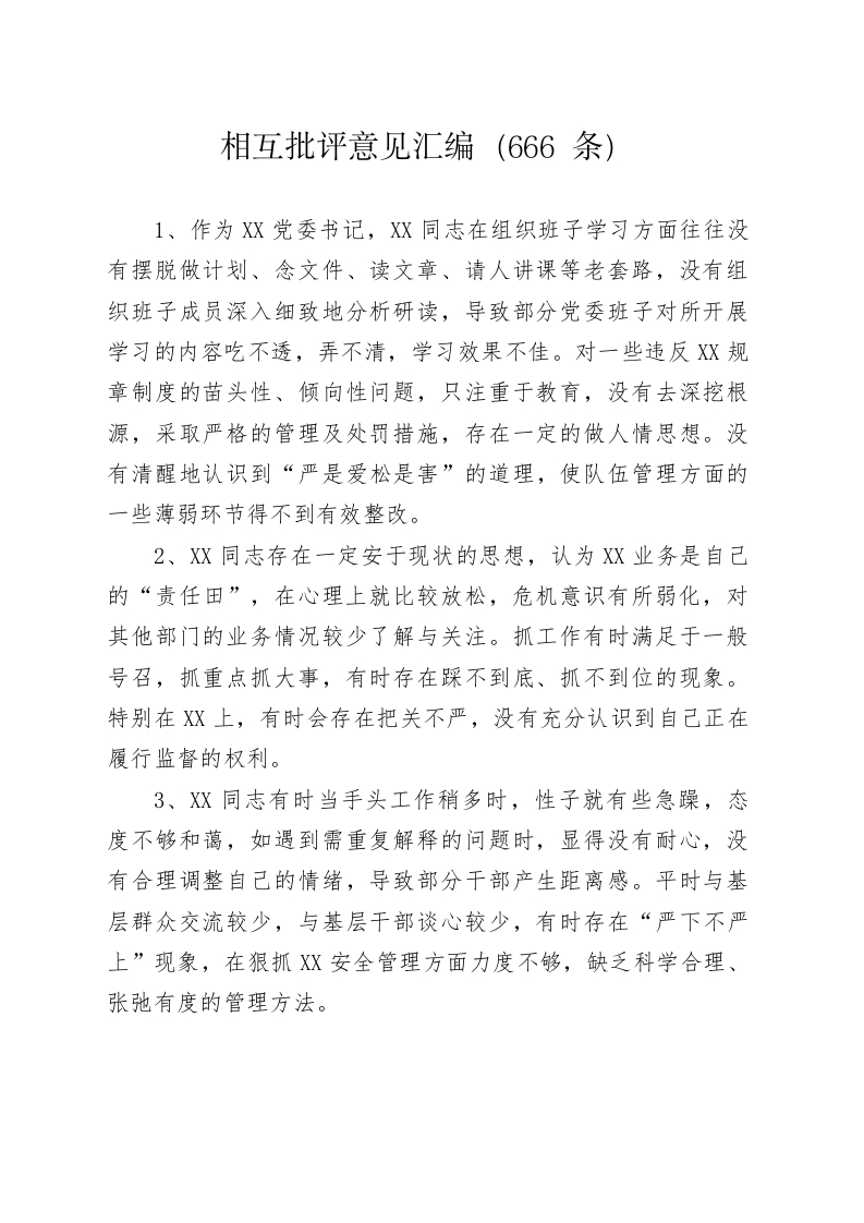 相互批评意见汇编(666条)1、作为XX党委书记,XX同志在组织班子学习方面往往没有摆脱做计划、念文件、读文章、请人讲课等老套路,没有组织班子成员深入细致地分析研读,导致部分党委班子对所开展学习的内容吃不透,弄不清,学习效果不佳。对一些违反X规章制度的苗头性、倾向性问题,只注重于教育,没有去深挖根源,采取严格的管理及处罚措施,存在一定的做人情思想。没有清醒地认识到“严是爱松是害”的道理,使队伍管理方面的一些薄弱环节得不到有效整改。2、XX同志存在一定安于现状的思想,认为XX业务是自己的“责任田”,在心理上就比较放松,危机意识有所弱化,对其他部门的业务情况较少了解与关注。抓工作有时满足于一般号召,抓重点抓大事,有时存在踩不到底、抓不到位的现象。特别在XX上,有时会存在把关不严,没有充分认识到自己正在履行监督的权利。3、XX同志有时当手头工作稍多时,性子就有些急躁,态度不够和蔼,如遇到需重复解释的问题时,显得没有耐心,没有合理调整自己的情绪,导致部分干部产生距离感。平时与基层群众交流较少,与基层干部谈心较少,有时存在“严下不严上”现象,在狠抓XX安全管理方面力度不够,缺乏科学合理、张弛有度的管理方法。4、XX同志担任了XX后,在进取意识和创新精神上比较缺乏,在思想上有所放松。深入基层不够,对基层情况掌握不深不细,虽然自己也经常到基层单位调研,但了解掌握基层群众的呼声不全面,对指导推动XX发展大胆探索的方式方法较少。对一些工作满足于会开了、部署过了,至于进度如何,有何困难,落实与否,缺乏盯住不放,缺乏不间断检查督导。5、XX同志平时忙于机关事务,下基层指导少。即使下去检查,也存在沉不下去、蹲不住、走马观花的现象。遇到一些难办问题,存在等“靠”上级机关,“靠”下级下属的思想,自己想方设法主动解决不够。因此有时工作显得比较被动,也直接影响了一些问题的解决时效。同时,为协调、推动有关工作和争取辖区业务、经费等各个方面的关注、帮助和支持,有时也参加吃请,在一定程度上宽容了一些不良风气。6、XX同志在贯彻落实上级工作部署方面重过程轻实效,以会议贯彻会议、就文件落实文件的现象还是存在,下基层检查工作偏重于检查台帐、会议记录、个人笔记,对于开展每项工作,比较注重宣传效应,经常是强调信息稿件、简报的多,具体有没有落实、效果怎么样过问的少,一定程度上造成了重形式、轻内容的导向,增加了基层的负担,影响了工作实效。7、XX同志下基层调研时存在“走马观花、蜻蜓点水”的现象,对群众的所需所求不能全面掌握,对他们反映的问题有时解决得不够周全及时。同时,个人学习方面存在应付现象,系统学习理论不多,学习上级文件讲话精神有时理解不透彻,