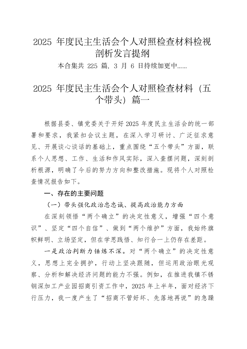 2025年度民主生活会个人对照检查材料检视剖析发言提纲本合集共225篇,3月6日持续加更中.…2025年度民主生活会个人对照检查材料(五个带头)篇一根据县委、镇党委关于开好2025年度民主生活会的统一部署和要求,我紧扣会议主题,在深入学习研讨、广泛征求意见、开展谈心谈话的基础上,重点围绕“五个带头”方面,联系个人思想、工作、生活和作风实际,深入查摆问题,深刻剖析根源,明确了今后的努力方向和整改措施。现将个人对照检查情况报告如下。一、存在的主要问题(一)带头强化政治忠忠诚、提高政治能力方面在深刻领悟“两个确立”的决定性意义,增强“四个意识”、坚定“四个自信”、做到“两个维护”方面,我始终旗帜鲜明、立场坚定,但在学思践悟、知行合一上仍存在差距。一是政治判断力锤炼不深。对“两个确立”的决定性意义,思想上完全拥护,行动上坚决跟随,但运用政治眼光观察、分析和解决经济问题的能力不强。例如,在推进我镇不锈钢深加工产业园招商引资工作中,2025年上半年,面对经济下行压力,我一度产生了“招商不管好坏、先落地再说”的急躁情绪,对个别技术含量不高、能耗偏大的项目放松了准入门槛,未能从一开始就完全站稳“高质量发展”这一政治立场,导致后期不得不投入更多精力进行引导和整改,这实质上是对党中央新发展理念贯彻得不坚决、不彻底的表现。二是政治领悟力领会不透。对党中央大政方针的学习领会,有时停留在“读了、学了”的层面,对其背后的战略意图、政治考量和实践要求思考不深,导致在结合分管领域创造性抓落实上办法不多。例如,党中央强调要统筹发展和安全,但我有时在抓项目建设、促进工业增长时,更多地关注进度和数据,对产业链安全、供应链韧性等“国之大者”思考谋划不周。在2025年第三季度的一次项目推进会上,我仅强调了xx项目必须在年底前完成投资额的Xx%,却对该项目关键零部件依赖进口可能存在的“卡脖子”风险研判不足、提醒不够,体现了政治领悟上的短板。三是政治执行力落实不力。在贯彻落实上级决策部署时,虽然能做到令行禁止,但有时存在“等靠要”思想,缺乏主动性和前瞻性,对执行过程中可能出现的意识形态风险预见性不强。例如,在引进一家外资背景的企业时,我主要审查了其资金、技术和市场前景,但在尽职调查中,对其企业文化、价值观导向和内部培训中可能存在的意识形态渗透风险,没有作为一项重要内容进行前置审查和评估,这反映出我在执行对外开放政策时,政治上的警惕性和敏锐性不高,未能将意识形态安全贯穿于经济工作的全过程。