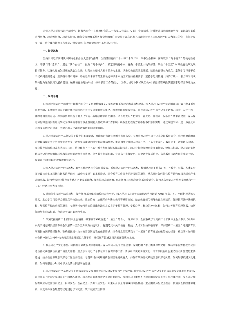 为深入学习贯利习近平新代中国特色社会主义思想和党的二十大及二十届三中、四中全会精神,持球提升局党组理论学习中心组成员的政治判断力、攻治领悟力、攻治执行力,确保全市教有系统各级党组织和广大党员干都在思想上攻治上行动上同以习近平同志为核心的党中央保持高度一致,结合我市教有工作实际,制定226年度理论学习中心组学习计划.一、指导思想坚持以习近平新时代中特色社会主义思想为指导,全面贯制党的二十大和二十届三中、四中全会精神,深刻领俗“两个确立”的决定性意目标任务,以深化党的创新理论武装为主线。以落实立德树人根本任务为主题,以推动教有高质量发展、建设教有强市为重点,系统学习习近平总书记系列重要论述、重要指示批示精神,特别是关于教有的重要论述和关于本地区工作的重要要求。坚持学思用贯通、知信行统一,着力将学习成果转化为谋划教有发展的思路、破解教有难题的举措、推动教有工作的能力,为裔力增写中国式现代化体市教有新篇章提供坚强思想闲旺和理论支撑二、学习专题1深把塑习近平新代中国特色社会主义思想精衡要义,筑牢教有系统攻治忠诚思想根基.深入学习《习近平谈治国理攻》第五卷及系列重要文献,系统额会习近平新倒代中国特色社会主义思想的核心要义、精神实质和实践要求。重点所读习近平总书记关于教有、科技、人才工作一体推进的重要论述。深感否其中蕴含的人民立场、战略思维和历史担当。结合局党组“把方向、管大局、作决策、保落实”的职责定位,深入深讨如阿将党的创新理论转化为推动我市教有事业发展的具体政策和工作机制,确保党的教有方针不折不扣落到实处。通过专题学习,进一步强化中2.学习贯材习近平总书记关于教有的重要论述,明确新时代新征程教有发展方位。专题学习习近平总书记在全国教有大会、学校思想政治理论课教师座谈会上的重要讲话及关于教有强国建设的重要指示批示精神。重点跳立德树人根本任务、“五有并举”、教有公平、教师队伍建设、深化教有领域综合改革等核心内容,结合我市“十五五”教有发展规划实施关键节点,深入分析我市教有发展的优势、短板与机遇。学习所讨如阿泵索符合市实际的教有现代化路径3深入学习习近平经济思想。服务区域经济社会高质量发展。系统学习习近平经济思想。特别是习近平总书记关于“教有、科技、人才是全面建设社会主义现代化国家的基础性、战略性支撑”的重要论述。结合教有工作服务经济发展的眼能,重点研讨如啊优化教有结构布局以适应产业升级需求,如何赠强职业教有服务地方产业发展能力,如何推动高等教有、职业教有与区域心新体系深度融合,如何以高质量人才培养支撑我市“十五五”经济社会发展目标4贯落实习近平法治思想,提升教有系统依法治教能力和水平。深入学习《习近平法治思想学习钢要(②25年版)》,全面把翅其核心要义。重点学习习近平总书记关于依法治教、依法治校、加强青少年法治教有等重要论述。结合教有御门领导教有立法建议、保障教有法补法规执行、规范教有行政决策的职责。专题所讨如阿将法治思维和法治方式贯穿于教有管理、学校动学、权登保护全过程,如何完善教有治理体系,如何5深把塑党的二十届四中全会精神,疑聚教有系统奋进“十五五”的合力。原原本本、全而系统学习党的二十届四中全会公报及《中共中央关于制定国民经济和社会发展第十五个五年规划的建议》,特别是其中关于教有、科技、人才工作的战略曙。深理解“十五五”时期教有发展面临的新形势新任务,准确把翅党中央对教有建设的最新要求。结合局党组领导我巾“十五五”教有规划实施的核心任务,重点研讨如阿将速性转化和心创新性发展”的重大都署。重点学习习近平总书记关于意识形态工作、传承中华优秀传统文化、培有和践行社会主义核心价值观的重要设,如何赠强青少年对中华文化的认同感和自豪感.7.学习贯制习近平总书记关于总国家安全观的重要论述,建设更高水平平安校国.系统学习习近平总书记关于总体国家安全观的重要论述,重点额会“统筹发展和安全”的核心要求。结合教有系统维护安全稳定的职责。专题学习《中华人民共和国国家安全法》等法法规深入所讨如设、突发事件应急处置等议题进行学习交流,筑牢园安全防线。&深学细悟习近平总书记关于科技越新的重要论述,培有教有发展新动能。深入学习习近平总书记关于“科技自立自强”,“在教有‘双减中好科学教育加法”等重要论述。结合教有都门推动科学教有、培养创新人才的实际,专题所讨如啊提升青少年科学素养和心新能力,如何推动9贯利习近平总书记关于“三农”工作的重要论述,助力乡村教有全面源兴。深入学习习近平总书记关于“三农”工作的重要指示。系统学1.落实习近平总书记关于城市工作的重要论述,提升教有服务城市发展能级。深入学习习近平总书记关于“人民城市人民建,人民城市为人民”的重要理多。结合教有工作,专题所讨如阿优化教有资源配置以适应城市发展规财。如何通过教有增强城市活力与吸引力,如何推动学习型城市建设,如何解决随迁子女入学、学区优化等市民关心的教有热点难点问题,让教有发展更好服务城市