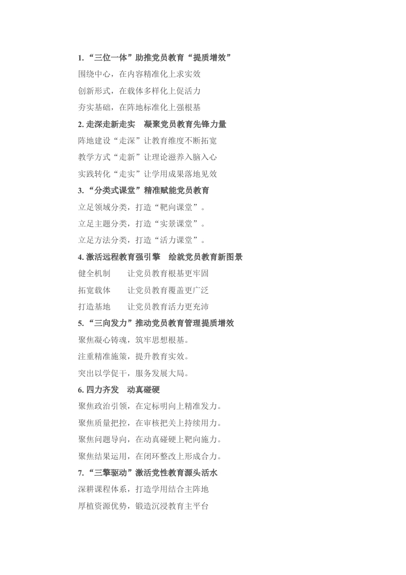 1.“三位一体”助推党员教育“提质增效”围绕中心,在内容精准化上求实效创新形式,在载体多样化上促活力夯实基础,在阵地标准化上强根基2.走深走新走实凝聚党员教育先锋力量阵地建设“走深”让教育维度不断拓宽教学方式“走新”让理论滋养入脑入心实践转化“走实”让学用成果落地见效3.“分类式课堂”精准赋能党员教育立足领域分类,打造“靶向课堂”。立足主题分类,打造“实景课堂”。立足方法分类,打造“活力课堂”。4.激活远程教育强引擎绘就党员教育新图景健全机制让党员教育根基更牢固拓宽载体让党员教育覆盖更广泛打造基地让党员教育活力更充沛5.“三向发力”推动党员教育管理提质增效聚焦凝心铸魂,筑牢思想根基。注重精准施策,提升教育实效。突出以学促干,服务发展大局。6.四力齐发动真碰硬聚焦政治引领,在定标明向上精准发力。聚焦质量把控,在审核把关上持续用力。聚焦问题导向,在动真碰硬上靶向施力。聚焦结果运用,在闭环整改上形成合力。7.“三擎驱动”激活党性教育源头活水深耕课程体系,打造学用结合主阵地厚植资源优势,锻造沉浸教育主平台完善考评机制,激活成效转化主动力8.党建引领“三治融合”激活乡村治理新动能自治筑基激发群众内生动力法治固本夯实平安稳定根基德治润心培育乡村文明风尚9.精准滴灌学用相长党员教育“实”招频出以“实”导航筑牢思想根基向“实”聚力提升培训精度用“实”破局创新教学方法10.站点送学铸初心榜样引领助振兴集中学习强根基。身边榜样传薪火。微党课里话成长。11.“七个一批”建强村党组织书记后备军近牵远引拓宽“储备链”淬炼提能优化“培育链”动态管理抓实“管理链”12.“冷资源”点燃冬日“热经济”党建领航让冰雪资源“活”起来党员带头让冰雪经济“热”起来党群联动让冰雪文化“火”起来13.“导师帮带”传薪火淬炼基层“生力军”精准结对,夯实“传帮带”根基。多维帮带,提升“实战化”本领。常态评价,推动“实效性”落地。14.“双轮驱动”育人才精耕细作促发展搭建平台,强化实践淬炼。建强机制,优化育才生态。
