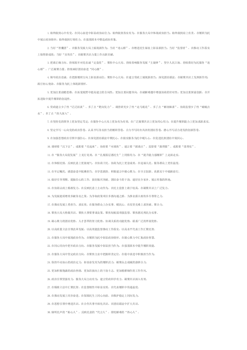 2当好“智囊团”,在服务发展大局上展现新作为:当好“连心桥”,在增进民生相祉上彰显新担当:当好“监督者”,在推动工作落实上取得新成效:当好“宜传员”,在凝聚共识力量上作出新贡就践行初心使命,在服务为民上体现新情杯水”,多了点“持久深入”。?.在坚持党的领导上更加坚定笃定,在服务中心大局上更加有为有效,在广泛凝聚共识上更加用心用力,在提升履职能力上更加求新求实.8坚定书写一心向党的政治答卷,认真书写务实担当的限职答卷,合力书写引同舟共济的团结答卷,潜心书写活力进发的创新答卷。11.在“服务大局促发展”上见行见效,在“扎根基层惠民生”上用情用力,在“提升能力强限职”上走深走实1了.在推动发展上勇担当、求实效,在服务群众上办实事、暖民心,在攻坚克难上求突破、聚合力18聚焦大局大势凝共识,聚焦大事要事谋良策,聚焦短板弱强监督。聚焦惠民利民办实事23.在服务大局中坚定攻治方向,在聚焦主业中把塑职责定位,在稳中求进中积极担当作为29.在思想引领中增进共识,在合作共事中深化共识,在团结联谊中扩大共识3礼在协商中增进理解在交流中促进认同。在团中汇聚力量