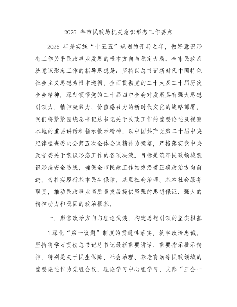 2026年市民政局机关意识形态工作要点2026年是实施“十五五”规划的开局之年,做好意识形态工作关乎民政事业发展的根本方向与稳定大局。全市民政系统意识形态工作的指导思想是:坚持以总书记新时代中国特色社会主义思想为根本遵循,全面贯彻党的二十大及二十届历次全会精神,深刻领悟党的二十届四中全会对发展具有强大思想引领力、精神凝聚力、价值感召力的新时代文化的战略部署。我们将紧紧围绕总书记总书记关于民政工作的重要论述及视察本地的重要讲话和指示批示精神,以中国共产党第二十届中央纪律检查委员会第五次全体会议精神为镜鉴,严格落实党中央及省委关于意识形态工作的各项决策。目标是筑牢民政领域意识形态安全防线,确保全市民政工作始终沿着正确政治方向前进,为扎实履行基本民生保障、基层社会治理、基本社会服务职责,推动民政事业高质量发展提供坚强的思想保证、强大的精神动力和稳固的政治根基。一、聚焦政治方向与理论武装,构建思想引领的坚实根基1.深化“第一议题”制度的贯通性落实,筑牢政治忠诚。坚持将学习贯彻总书记总书记最新重要讲话、重要指示批示精神,特别是关于民生保障、社会治理、养老育幼等民政领域的重要论述作为党组会议、理论学习中心组学习、支部“三会一课”的“第一议题”。学习的核心在于实现从“传达学习”到“研究落实”的闭环。我们将建立“知、督、促”与“回头看”相结合的机制,每季度对学习贯彻情况进行专项督查,重点检视是否将总书记的指示要求转化为具体的政策设计、项目安排和工作举措。在制定“十五五”民政事业发展规划时,必须将总书记关于共同富裕、积极应对人口老龄化、基层治理现代化等战略思想作为规划的灵魂主线,进行专题研讨和对接细化。通过这种贯通式学习,引导全体党员干部深刻领悟“两个确立”的决定性意义,将其内化为做到“两个维护”的政治自觉、思想自觉和行动自觉,确保民政事业始终沿着总书记指引的方向笃定前行。2.构建分层分类的理论武装体系,实现全员覆盖。理论武装必须克服“上下一般粗”的问题,针对不同层级、不同岗位的干部职工实施精准化教育。对于局领导班子成员和处级干部,重点在于提升战略思维和理论转化能力,通过举办“民政高质量发展专题研讨班”,围绕党的二十届四中全会精神与民政“十五五”发展深度融合等议题进行深度学习与研讨。对于中层业务骨干,侧重政策解读与执行力培养,开展“政策前沿与实务创新”系列讲座,将党的创新理论分解落实到社会救助、养老服务、儿童福利等具体业务的政策完善中。对于一线窗口