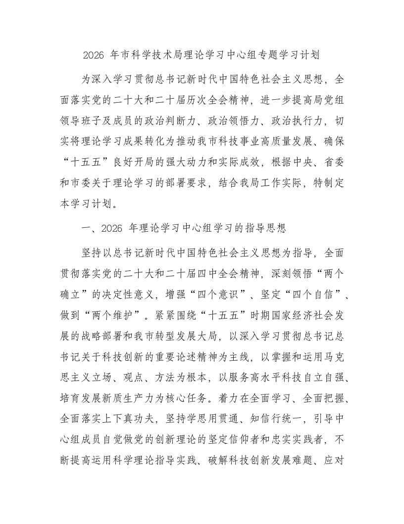 2026年市科学技术局理论学习中心组专题学习计划为深入学习贯彻总书记新时代中国特色社会主义思想,全面落实党的二十大和二十届历次全会精神,进一步提高局党组领导班子及成员的政治判断力、政治领悟力、政治执行力,切实将理论学习成果转化为推动我市科技事业高质量发展、确保“十五五”良好开局的强大动力和实际成效,根据中央、省委和市委关于理论学习的部署要求,结合我局工作实际,特制定本学习计划。一、2026年理论学习中心组学习的指导思想坚持以总书记新时代中国特色社会主义思想为指导,全面贯彻落实党的二十大和二十届四中全会精神,深刻领悟“两个确立”的决定性意义,增强“四个意识”、坚定“四个自信”、做到“两个维护”。紧紧围绕“十五五”时期国家经济社会发展的战略部署和我市转型发展大局,以深入学习贯彻总书记总书记关于科技创新的重要论述精神为主线,以掌握和运用马克思主义立场、观点、方法为根本,以服务高水平科技自立自强、培育发展新质生产力为核心任务。着力在全面学习、全面把握、全面落实上下真功夫,坚持学思用贯通、知信行统一,引导中心组成员自觉做党的创新理论的坚定信仰者和忠实实践者,不断提高运用科学理论指导实践、破解科技创新发展难题、应对风险挑战的能力,为加快建设我市区域科技创新中心,将科技资源优势转化为高质量发展优势提供坚强思想保证和理论支撑。二、学习专题与主要内容2026年度理论学习中心组学习,在全面系统学习总书记新时代中国特色社会主义思想的基础上,重点安排以下十四个专题。1.深入学习领会总书记总书记关于科技创新重要论述的核心要义与时代价值,筑牢科技自立自强的思想根基。本专题旨在系统追溯和深刻把握总书记总书记关于科技创新重要论述的形成脉络、理论渊源与实践基础,领会其作为马克思主义科技观中国化时代化最新成果的历史地位。重点学习《总书记关于科技创新论述摘编》、《总书记谈治国理政》(第五卷)中关于科技创新的系列篇章,以及总书记在院士大会、国家科学技术奖励大会上的重要讲话。深入理解“创新是引领发展的第一动力”这一重大论断的深远战略考量,深刻认识科技创新在中国式现代化全局中的核心地位。要结合世界科技革命史和我国近代发展史,领悟“科技实力决定着世界政治经济力量对比的变化,也决定着各国各民族的前途命运”的深刻内涵,从历史与现实相贯通的维度,增强加快推进高水平科技自立自强的历