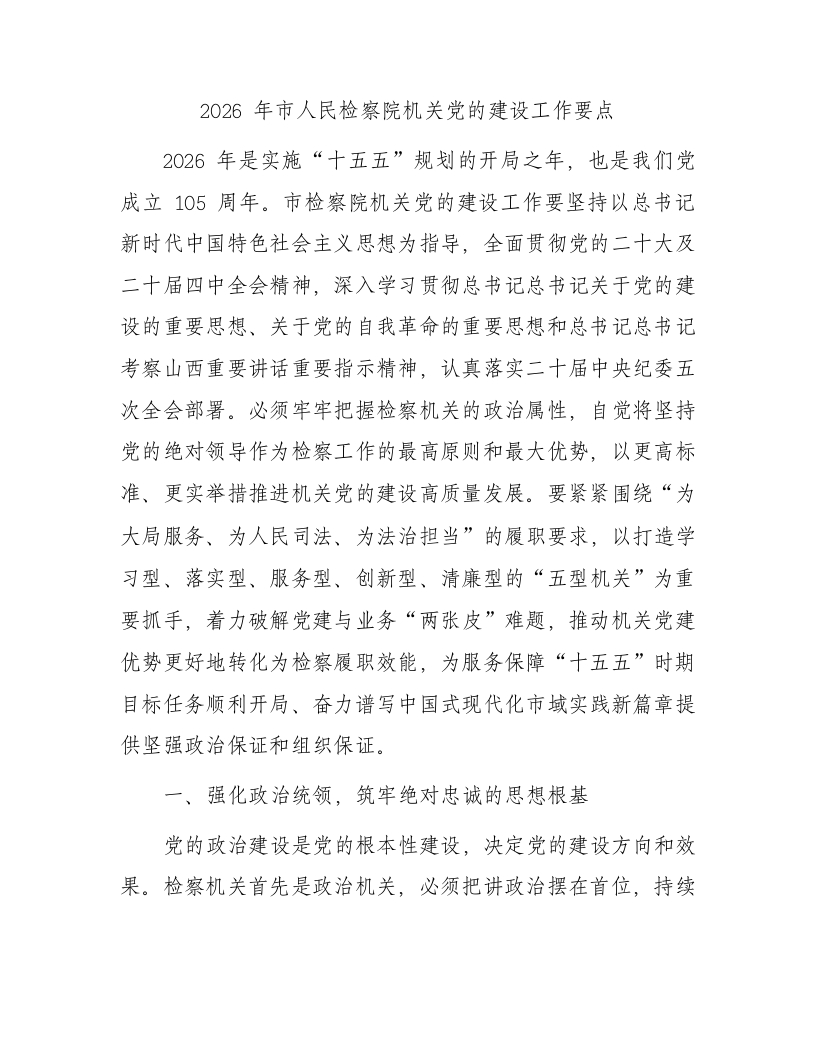 2026年市人民检察院机关党的建设工作要点2026年是实施“十五五”规划的开局之年,也是我们党成立105周年。市检察院机关党的建设工作要坚持以总书记新时代中国特色社会主义思想为指导,全面贯彻党的二十大及二十届四中全会精神,深入学习贯彻总书记总书记关于党的建设的重要思想、关于党的自我革命的重要思想和总书记总书记考察山西重要讲话重要指示精神,认真落实二十届中央纪委五次全会部署。必须牢牢把握检察机关的政治属性,自觉将坚持党的绝对领导作为检察工作的最高原则和最大优势,以更高标准、更实举措推进机关党的建设高质量发展。要紧紧围绕“为大局服务、为人民司法、为法治担当”的履职要求,以打造学习型、落实型、服务型、创新型、清廉型的“五型机关”为重要抓手,着力破解党建与业务“两张皮”难题,推动机关党建优势更好地转化为检察履职效能,为服务保障“十五五”时期目标任务顺利开局、奋力谱写中国式现代化市域实践新篇章提供坚强政治保证和组织保证。一、强化政治统领,筑牢绝对忠诚的思想根基党的政治建设是党的根本性建设,决定党的建设方向和效果。检察机关首先是政治机关,必须把讲政治摆在首位,持续深化政治机关意识教育,确保检察工作始终沿着正确政治方向前进。1.坚定不移把“两个维护”落到实处。将“两个维护”作为最高政治原则和根本政治规矩,融入检察履职全过程、各环节。健全完善总书记总书记重要指示批示精神和党中央重大决策部署在检察机关的落实机制,确保不折不扣贯彻执行。严格执行重大事项请示报告制度,检察工作中的重要部署、重大问题、重大案件必须主动及时向党委和上级院党组请示报告。常态化开展对党忠诚教育和政治纪律、政治规矩教育,引导全体检察人员深刻领悟“两个确立”的决定性意义,不断提高政治判断力、政治领悟力、政治执行力。坚决同一切违背和损害“两个维护”的言行作斗争,严肃查处“七个有之”问题,坚决清除对党不忠诚不老实、阳奉阴违的“两面人”,切实维护党的团结统一和集中统一领导。2.持续巩固深化党的创新理论武装。坚持将学习贯彻总书记新时代中国特色社会主义思想作为首要政治任务,严格落实“第一议题”制度,做到学思用贯通、知信行统一。重点围绕总书记法治思想、总书记总书记关于党的建设的重要思想、关于党的自我革命的重要思想,以及总书记总书记考察山西重要讲话重要指示精神,制定年度理论学习计划,分专题开展深入