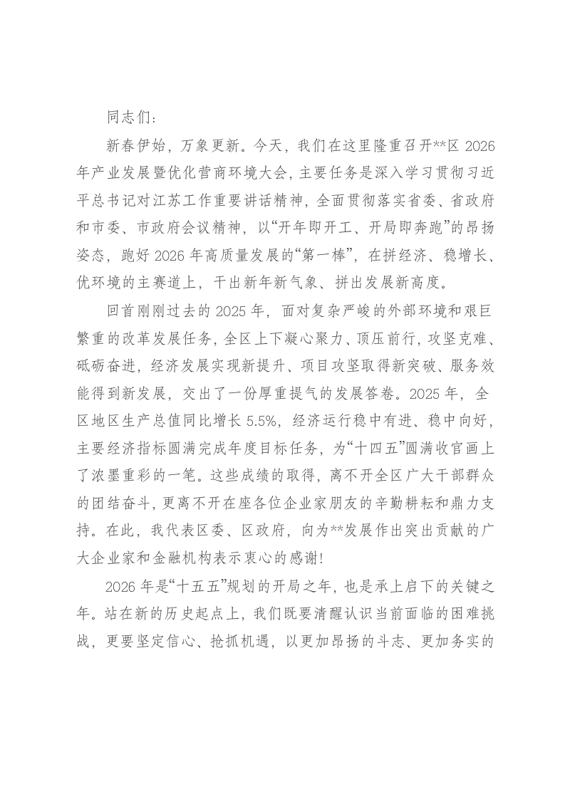 同志们:新春伊始,万象更新。今天,我们在这里隆重召开*区2026年产业发展暨优化营商环境大会,主要任务是深入学习贯彻习近平总书记对江苏工作重要讲话精神,全面贯彻落实省委、省政府和市委、市政府会议精神,以“开年即开工、开局即奔跑”的昂扬姿态,跑好2026年高质量发展的“第一棒”,在拼经济、稳增长、优环境的主赛道上,干出新年新气象、拼出发展新高度。回首刚刚过去的2025年,面对复杂严峻的外部环境和艰巨繁重的改革发展任务,全区上下凝心聚力、顶压前行,攻坚克难、砥砺奋进,经济发展实现新提升、项目攻坚取得新突破、服务效能得到新发展,交出了一份厚重提气的发展答卷。2025年,全区地区生产总值同比增长5.5%,经济运行稳中有进、稳中向好,主要经济指标圆满完成年度目标任务,为“十四五”圆满收官画上了浓墨重彩的一笔。这些成绩的取得,离不开全区广大干部群众的团结奋斗,更离不开在座各位企业家朋友的辛勤耕耘和鼎力支持。在此,我代表区委、区政府,向为*发展作出突出贡献的广大企业家和金融机构表示衷心的感谢!2026年是“十五五”规划的开局之年,也是承上启下的关键之年。站在新的历史起点上,我们既要清醒认识当前面临的困难挑战,更要坚定信心、抢抓机遇,以更加昂扬的斗志、更加务实的作风、更加有力的举措,奋力谱写高质量发展新篇章。下面,我就做好今年产业发展和优化营商环境工作,讲四点意见。一、提高政治站位,锚定方向求实效政治站位决定工作格局,思想认识引领行动方向。全区上下必须从政治高度把握发展大势,从全局视野谋划发展路径,确保各项工作始终沿着正确方向前进。从习近平总书记重要论述重要讲话精神中把准政治方向。要深入学习贯彻习近平总书记对江苏工作重要讲话精神,深刻领悟“两个确立”的决定性意义,增强“四个意识”、坚定“四个自信”、坚决做到“两个维护”。要把学习贯彻习近平新时代中国特色社会主义思想作为首要政治任务,坚持学思用贯通、知信行统一,切实把学习成果转化为推动高质量发展的强大动力和实际成效。要胸怀“国之大者”,自觉把*发展放在全国、全省、全市大局中来谋划推进,确保党中央决策部署和省委、市委工作要求在*落地生根、开花结果。从“十五五”发展全局中找准战略方位。要紧密围绕中央和省委、市委“十五五”规划建议,找准融入和服务国家重大战略和区域协调发展的结合点、发力点。要准确把握长江经济带发展、长三角一体化发展等重大战略机遇,主动对接上海、南京等中心城市,在产业协作、科技创新、人才交流等方面深化合作,不断提升区域协同发展水平。要把准“十五五”时期高质量发展的主题主