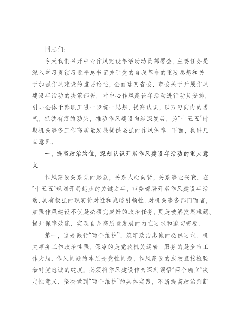 同志们:今天我们召开中心作风建设年活动动员部署会,主要任务是深入学习贯彻习近平总书记关于党的自我革命的重要思想和关于加强作风建设的重要论述,全面落实省委、市委关于开展作风建设年活动的决策部署,对中心作风建设年活动进行动员安排,引导全体干部职工进一步统一思想、提高认识,以刀刃向内的勇气、抓铁有痕的劲头,推动作风建设向纵深发展,为“十五五”时期机关事务工作高质量发展提供坚强的作风保障。下面,我讲几点意见。一、提高政治站位,深刻认识开展作风建设年活动的重大意义作风建设关系党的形象,关系人心向背,关系事业兴衰。在“十五五”规划开局起步的关键之年,市委部署开展作风建设年活动,具有极强的现实针对性和战略引领性。对机关事务部门而言,加强作风建设不仅是必须完成好的政治任务,更是破解发展难题、提升保障效能、实现自身高质量发展的内在要求和迫切需要。第一,这是践行“两个维护”、筑牢政治忠诚的必然要求。机关事务工作政治性强,保障的是党政机关运转,服务的是全市工作大局。作风问题的本质是党性问题,作风建设的成效直接检验着对党忠诚的纯度。必须将作风建设作为深刻领悟“两个确立”决定性意义、坚决做到“两个维护”的具体实践,不断提高政治判断力、政治领悟力、政治执行力,确保机关事务工作始终沿着正确方向前进。第二,这是服务发展大局、保障高效运转的迫切需要。2026年是“十五五”开局之年,全市经济社会发展任务艰巨繁重。机关事务工作承担着“保障、服务、管理”的重要职能,是机关运行的“大后方”。没有过硬的作风,就难以提供高水平、高质量、高效能的保障服务,就可能影响全市中心工作的推进。必须通过作风建设,锤炼一支关键时刻拉得出、冲得上、打得赢的过硬队伍,切实当好机关运行的“保障部”、重大活动的“服务队”。第三,这是破解瓶颈问题、锻造过硬队伍的关键举措。对标新时代新要求,对照市委指出的“十个方面”突出问题,中心干部队伍在思想观念、能力素质、工作作风、服务效能上仍有提升空间。有的同志存在“按部就班、求稳怕难”的思想,创新突破意识不强;有的存在“重管理、轻服务”的倾向,精细化、人性化服务水平有待提高;有的在制度执行上打折扣、搞变通,节约型机关建设仍需深化。开展作风建设年活动,就是要以自我革命精神,深挖细查这些问题,动真碰硬加以解决,锻造一支忠诚干净担当的机关事务铁军。二、坚持问题导向,精准把握作风建设年活动的目标任务市委对这次作风建设年活动提出了“动真碰硬转作风、锚定目标提效能”的明确要求。中心全体干部职工必须坚持问题导向、