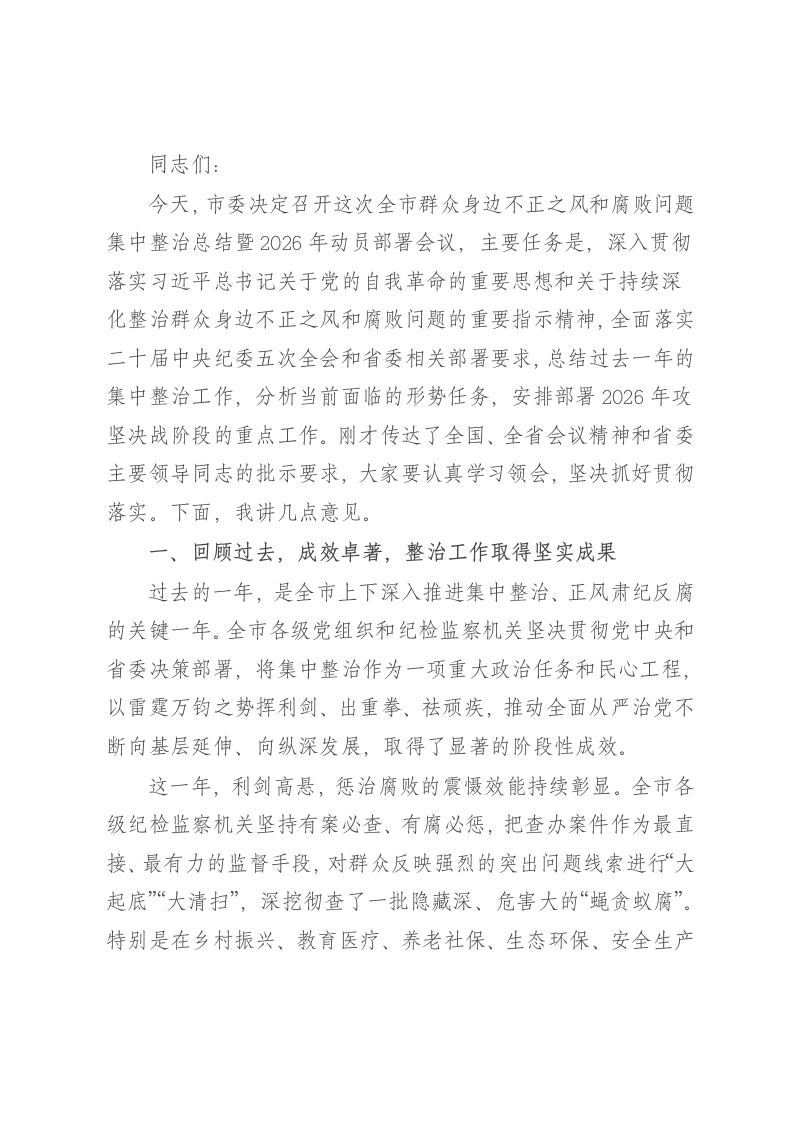 同志们:今天,市委决定召开这次全市群众身边不正之风和腐败问题集中整治总结暨2026年动员部署会议,主要任务是,深入贯彻落实习近平总书记关于党的自我革命的重要思想和关于持续深化整治群众身边不正之风和腐败问题的重要指示精神,全面落实二十届中央纪委五次全会和省委相关部署要求,总结过去一年的集中整治工作,分析当前面临的形势任务,安排部署2026年攻坚决战阶段的重点工作。刚才传达了全国、全省会议精神和省委主要领导同志的批示要求,大家要认真学习领会,坚决抓好贯彻落实。下面,我讲几点意见。一、回顾过去,成效卓著,整治工作取得坚实成果过去的一年,是全市上下深入推进集中整治、正风肃纪反腐的关键一年。全市各级党组织和纪检监察机关坚决贯彻党中央和省委决策部署,将集中整治作为一项重大政治任务和民心工程,以雷霆万钧之势挥利剑、出重拳、祛顽疾,推动全面从严治党不断向基层延伸、向纵深发展,取得了显著的阶段性成效。这一年,利剑高悬,惩治腐败的震慑效能持续彰显。全市各级纪检监察机关坚持有案必查、有腐必惩,把查办案件作为最直接、最有力的监督手段,对群众反映强烈的突出问题线索进行“大起底”“大清扫”,深挖彻查了一批隐藏深、危害大的“蝇贪蚁腐”。特别是在乡村振兴、教育医疗、养老社保、生态环保、安全生产等重点领域,成功突破了一批群众深恶痛绝的典型案件。例如,严肃查处了某区教育系统部分人员内外勾结、侵占学生营养餐补助的案件,追回全部违纪违法资金,并对12名相关责任人进行了严肃处理;又如,针对农村集体“三资”管理混乱问题,在全市范围内开展专项清查,查处了某乡镇原负责人利用职权违规发包集体土地、侵吞集体资产的案件,有力维护了集体和村民的合法权益。这些案件的查处,充分彰显了市委猛药去疴、重典治乱的坚定决心,释放了全面从严、一严到底的强烈信号。这一年,人民至上,服务群众的民生福祉持续增进。集中整治的出发点和落脚点,是解决群众最关心、最直接、最现实的利益问题。各级各部门坚持把办好惠民实事作为检验整治成效的“试金石”,紧盯群众“急难愁盼”,推动解决了一大批历史遗留问题和现实民生难题。通过扎实有力的整治,一批长期困扰群众的“心头病”得到有效医治,一批事关群众福祉的“暖心事”得到妥善办理,人民群众的获得感、幸福感、安全感得到实实在在的提升,党在基层的执政根基也因此得到进一步夯实。这一年,固本培元,基层治理的政治生态持续净化。整治工作不仅是惩治腐败,更是对基层政治生态的一次全面“体检”和系统“修复”。通过深化以案促改、以案促治,倒逼相关地区和单位深刻反思、堵塞漏洞、健全制度。市民政局、市农业农村局等部门针对案件暴露出的监管短板,修订完善了30余项行业管理制度。一些县(市)纪委监委通过制发纪检监察建议书,推动地方