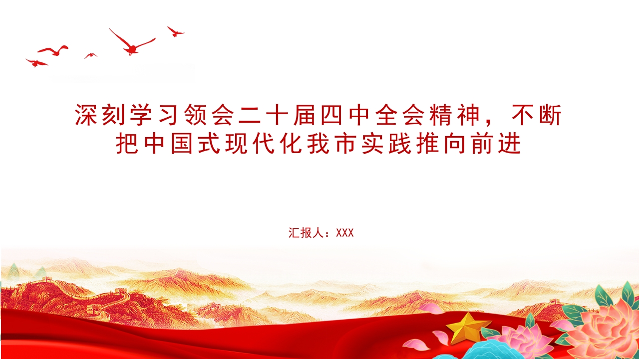 深刻学习领会二十届四中全会精神,不断把中国式现代化我市实践推向前进汇报人:XX前言党的二十届四中全会,恰逢”十四五"收官与"十五五"谋划的关键节点,既是对过往发展成就的系统总结,更是对未来五年乃至更长时期国家发展的战略擘画。全会审议通过的《中共中央关于制定国民经济和社会发展第十五个五年规划的建议》(以下简称《建议》),作为新时代又一重要纲领性文献,为接续推进中国式现代化注入了强劲动力。学习好、宣传好、贯彻好全会精神,是当前和今后一个时期全市上下的首要政治任务。我们要深刻领会全会精神实质,不断把中国式现代化我市实践推向前进