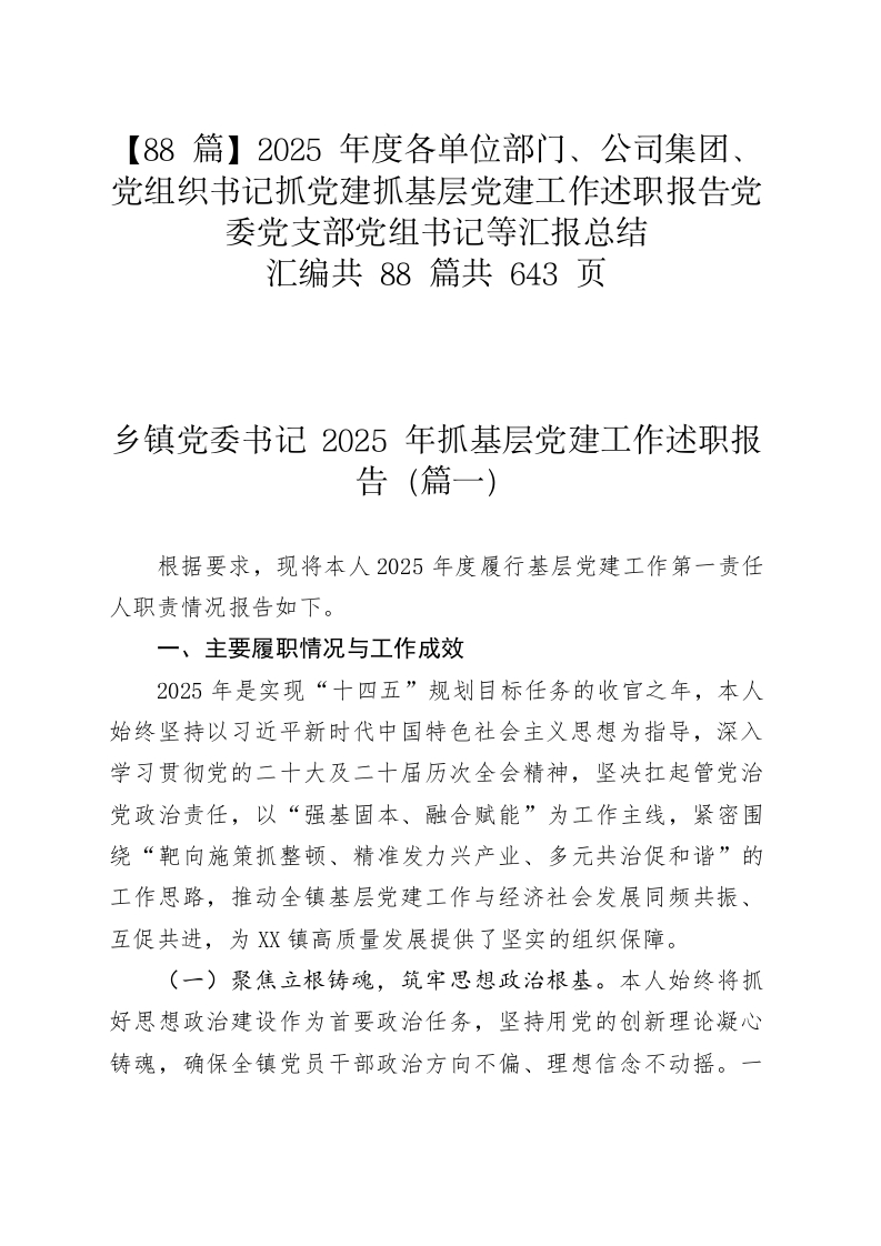【88篇】2025年度各单位部门、公司集团、党组织书记抓党建抓基层党建工作述职报告党委党支部党组书记等汇报总结汇编共88篇共643页乡镇党委书记2025年抓基层党建工作述职报根据要求,现将本人2025年度履行基层党建工作第一责任人职责情况报告如下。一、主要履职情况与工作成效2025年是实现“十四五”规划目标任务的收官之年,本人始终坚持以习近平新时代中国特色社会主义思想为指导,深入学习贯彻党的二十大及二十届历次全会精神,坚决扛起管党治党政治责任,以“强基固本、融合赋能”为工作主线,紧密围绕“靶向施策抓整顿、精准发力兴产业、多元共治促和谐”的工作思路,推动全镇基层党建工作与经济社会发展同频共振、互促共进,为XX镇高质量发展提供了坚实的组织保障。(一)聚焦立根铸魂,筑牢思想政治根基。本人始终将抓好思想政治建设作为首要政治任务,坚持用党的创新理论凝心铸魂,确保全镇党员干部政治方向不偏、理想信念不动摇。一是强化理论武装,提升政治能力。作为党委书记,我始终坚持领学促学,严格落实“第一议题”制度,带头主持召开党委会x次、党委理论学习中心组学习x次,系统学习习近平总书记系列重要讲话精神和党中央最新决策部署。通过以上率下,确保党的创新理论在党委层面第一时间学习、第一时间领会。扎实开展深入贯彻中央八项规定精神学习教育,组织党员干部认真学习《习近平关于加强党的作风建设论述摘编》,深入学习贯彻党的二十届四中全会精神,确保全镇党员干部在思想上政治上行动上同党中央保持高度一致。二是创新宣讲方式,推动理论入心。针对农村党员学习“凑不齐、听不懂”的现实难题,我牵头组织由党员干部、驻村干部、乡贤能人组成的“院坝宣讲队”,将“文件语”转化为群众听得懂的“乡土话”,将“大道理”转化为身边人身边事的“小故事”。今年以来,我亲自带队深入村组院落开展党的二十届四中全会精神等主题宣讲x余场次,覆盖党员群众x余人次,有效打通了理论武装“最后一公里”,引导广大群众感党恩、听党话、跟党走。三是坚持正风肃纪,涵养政治生态。我坚决扛起全面从严治党第一责任人职责,以开展深入贯彻中央八项规定精神学习教育为契机,深入贯彻中央八项规定精神。亲自部署开展群众身边不正风和腐败问题集中整治行动,组织全镇党员干部观看警示教育片x次,深入剖析典型案例x个,一体推进学查改,常态化为党员干部“敲警钟”,营造了风清气正的政治生态。