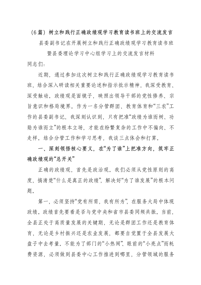 (6篇)树立和践行正确政绩观学习教育读书班上的交流发言县委副书记在开展树立和践行正确政绩观学习教育读书班暨县委理论学习中心组学习上的交流发言材料同志们:近期,通过参加这次树立和践行正确政绩观学习教育读书班,结合深入研读相关重要论述和指示批示精神,我深受教育、深受触动。政绩观是面镜子,映照出领导干部的党性修养、宗旨意识和格局境界。作为一名分管群团、教育体育和“三农”工作的县委副书记,我深刻认识到,只有把准“政绩为谁而树、功勋为谁而立”的根本立场,才能在纷繁复杂的工作中不偏向、不走样。结合分管工作和学习思考,我谈三点体会和打算。一、深刻领悟核心要义,在“为了谁”上把准方向,筑牢正确政绩观的“总开关”正确的政绩观,首先是政治观。我们必须从党性原则的高度,搞清楚“什么是真正的政绩”,解决好“为了谁发展”的根本问题。第一,必须坚持“党有所需,我有所为”在服务大局中体现政绩。政绩首先要看是否与党中央和省市县委同频共振。当前,全县正处于高质量发展的关键期,无论是群团工作还是教育体育,无论是乡村振兴还是农业发展,都要自觉置于全县发展大盘子中去考量。不能为了部门的“小热闹”眼前的“小亮点”而耗费资源,必须做到县委中心工作推进到哪里,分管领域的服务