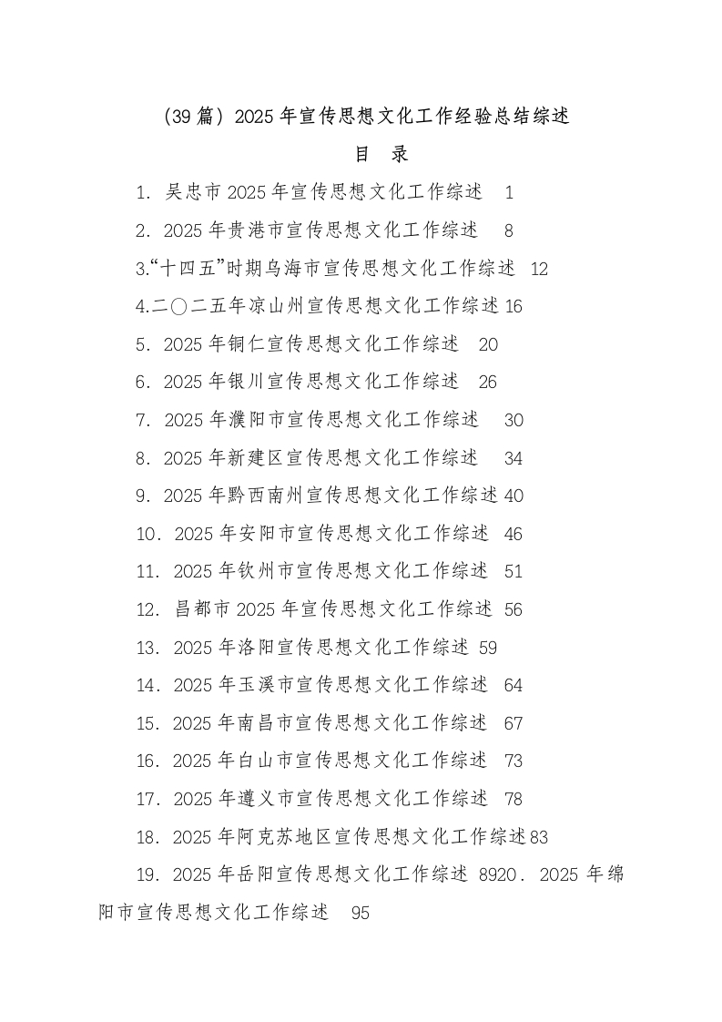 (39篇)2025年宣传思想文化工作经验总结综述目录1.吴忠市2025年宣传思想文化工作综述12.2025年贵港市宣传思想文化工作综述83.“十四五”时期乌海市宣传思想文化工作综述124.二○二五年凉山州宣传思想文化工作综述165.2025年铜仁宣传思想文化工作综述206.2025年银川宣传思想文化工作综述267.2025年濮阳市宣传思想文化工作综述308.2025年新建区宣传思想文化工作综述349.2025年黔西南州宣传思想文化工作综述4010.2025年安阳市宣传思想文化工作综述4611.2025年钦州市宣传思想文化工作综述5112.昌都市2025年宣传思想文化工作综述5613.2025年洛阳宣传思想文化工作综述5914.2025年玉溪市宣传思想文化工作综述6415.2025年南昌市宣传思想文化工作综述6716.2025年白山市宣传思想文化工作综述7317.2025年遵义市宣传思想文化工作综述7818.2025年阿克苏地区宣传思想文化工作综述8319.2025年岳阳宣传思想文化工作综述8920.2025年绵阳市宣传思想文化工作综述95