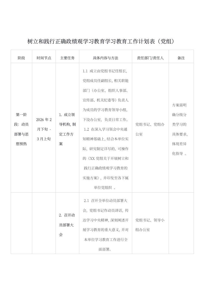 树立和践行正确政绩观学习教育学习教育工作计划表(党组)阶段时间节点主要任务具体内容与方法责任部门/责任人备注1.1成立由党组书记任组长,党组成员任副组长,相关职能部门(办公室、组织人事部、宣传部、机关纪委等)负责人方案需明为成员的学习教育领导小组,第一阶1.成立领确分级分2026年2下设办公室,负责日常工作。段:动员导机构,制党组书记、党组办类学习的1.2在深入学习领会中央通部署与思定工作方公室具体要求,3月上旬知精神基础上,结合本单位实想预热案体现差异际,研究制定详尽的、可操作化指导。的《XX党组关于开展树立和践行正确政绩观学习教育的实施方案》,并印发至各下属单位党组织。2.1召开全单位动员部署大会,党组书记作动员讲话,传2.召开动达学习中央精神,深刻阐述开党组书记、领导小员部署大展学习教育的重大意义,并对组办公室本单位学习教育工作进行全面部署。