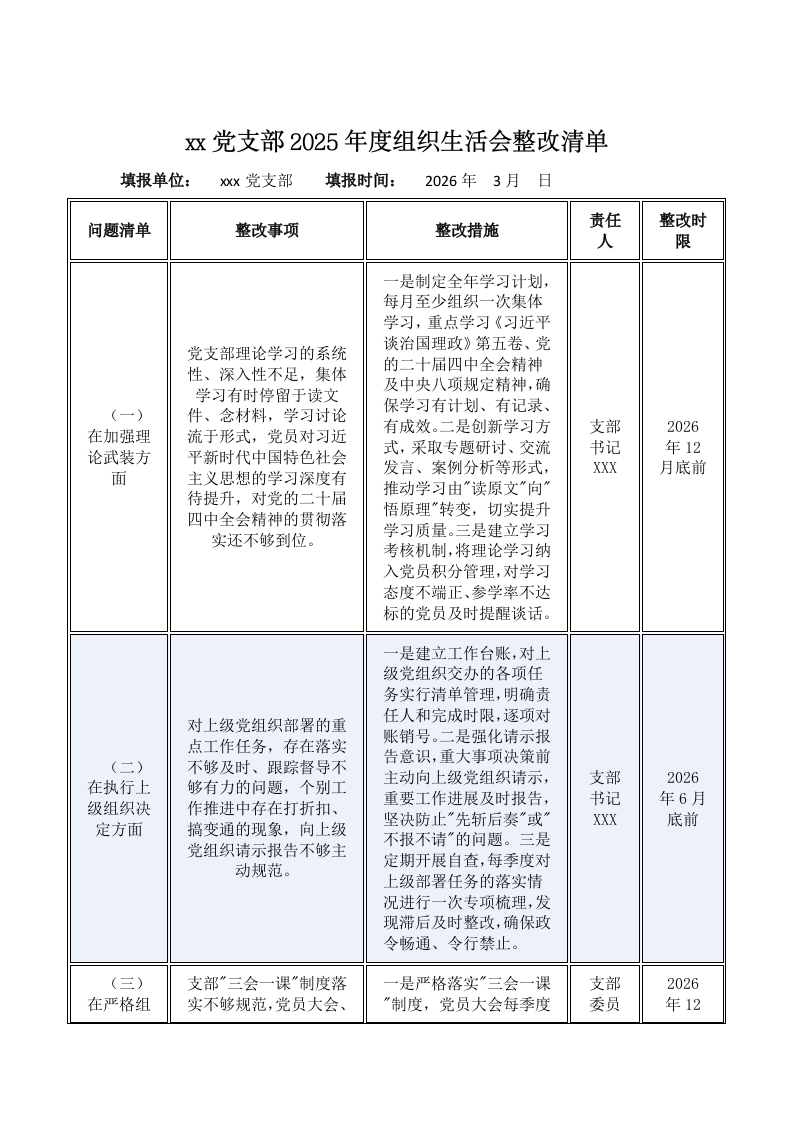 x巡党支部2025年度组织生活会整改清单填报单位:xx党支部填报时间:2026年3月日问题清单整改事项整改措施责任整改时人限一是制定全年学习计划,每月至少组织一次集体学习,重点学习《习近平党支部理论学习的系统谈治国理政》第五卷、党性、深入性不足,集体的二十届四中全会精神学习有时停留于读文及中央八项规定精神,确(一)件、念材料,学习讨论保学习有计划、有记录、在加强理流于形式,党员对习近有成效。二是创新学习方支2026论武装方平新时代中国特色社会式,采取专题研讨、交流书记年12发言、案例分析等形式,XXX月底前面主义思想的学习深度有待提升,对党的二十届推动学习由“读原文”向”四中全会精神的贯彻落悟原理“转变,切实提升实还不够到位。学习质量。三是建立学习考核机制,将理论学习纳入党员积分管理,对学习态度不端正、参学率不达标的党员及时提醒谈话。一是建立工作台账,对上级党组织交办的各项任务实行清单管理,明确责任人和完成时限,逐项对对上级党组织部署的重点工作任务,存在落实账销号。二是强化请示报告意识,重大事项决策前(二)不够及时、跟踪督导不在执行上够有力的问题,个别工主动向上级党组织请示,支部2026级组织决作推进中存在打折扣、重要工作进展及时报告,书记年6月定方面搞变通的现象,向上级坚决防止”先斩后奏”或”XXX底前党组织请示报告不够主不报不请”的问题。三是定期开展自查,每季度对动规范。上级部署任务的落实情况进行一次专项梳理,发现滞后及时整改,确保政令畅通、令行禁止。(三)支部”三会一课“制度落“是严格落实”三会一课支部2026在严格组实不够规范,党员大会、“制度,党员大会每季度委员年12