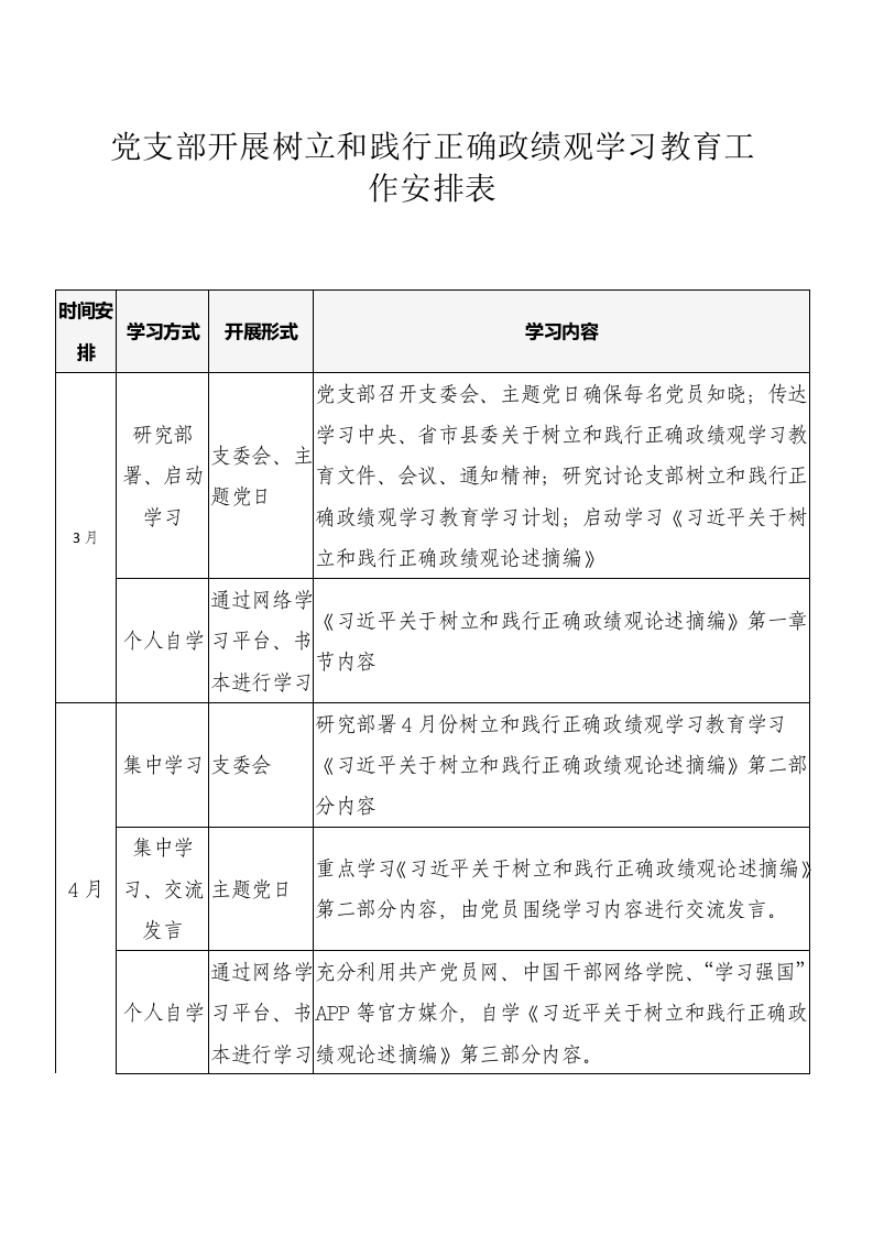 党支部开展树立和践行正确政绩观学习教育工作安排表时间安学习方式开展形式学习内容排党支部召开支委会、主题党日确保每名党员知晓;传达研究部学习中央、省市县委关于树立和践行正确政绩观学习教支委会、署、启动育文件、会议、通知精神;研究讨论支部树立和践行正题党日学习确政绩观学习教育学习计划;启动学习《习近平关于树3月立和践行正确政绩观论述摘编》通过网络学《习近平关于树立和践行正确政绩观论述摘编》第一章个人自学习平台、节内容本进行学习研究部署4月份树立和践行正确政绩观学习教育学习集中学习支委会《习近平关于树立和践行正确政绩观论述摘编》第二部分内容集中学重点学习《习近平关于树立和践行正确政绩观论述摘编》4月习、交流主题党日第二部分内容,由党员围绕学习内容进行交流发言。发言通过网络学充分利用共产党员网、中国干部网络学院、“学习强国”个人自学习平台、书APP等官方媒介,自学《习近平关于树立和践行正确政本进行学习绩观论述摘编》第三部分内容。