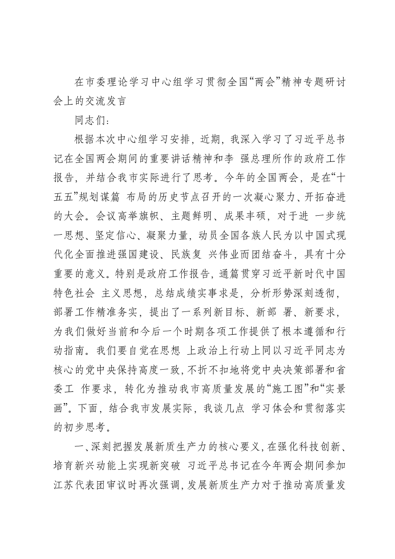 在市委理论学习中心组学习贯彻全国“两会”精神专题研讨会上的交流发言同志们:根据本次中心组学习安排,近期,我深入学习了习近平总书记在全国两会期间的重要讲话精神和李强总理所作的政府工作报告,并结合我市实际进行了思考。今年的全国两会,是在“十五五”规划谋篇布局的历史节点召开的一次凝心聚力、开拓奋进的大会。会议高举旗帜、主题鲜明、成果丰硕,对于进一步统一思想、坚定信心、凝聚力量,动员全国各族人民为以中国式现代化全面推进强国建设、民族复兴伟业而团结奋斗,具有十分重要的意义。特别是政府工作报告,通篇贯穿习近平新时代中国特色社会主义思想,总结成绩实事求是,分析形势深刻透彻,部署工作精准务实,提出了一系列新目标、新部署、新要求,为我们做好当前和今后一个时期各项工作提供了根本遵循和行动指南。我们要自觉在思想上政治上行动上同以习近平同志为核心的党中央保持高度一致,不折不扣地将党中央决策部署和省委工作要求,转化为推动我市高质量发展的“施工图”和“实景画”。下面,结合我市发展实际,我谈几点学习体会和贯彻落实的初步思考。一、深刻把握发展新质生产力的核心要义,在强化科技创新、培育新兴动能上实现新突破习近平总书记在今年两会期间参加江苏代表团审议时再次强调,发展新质生产力对于推动高质量发