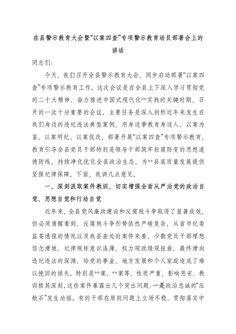 在县警示教育大会暨“以案四查”专项警示教育动员部署会上的讲话同志们:今天,我们召开全县警示教育大会,同步启动部署“以案四查”专项警示教育工作。这次会议是在全县上下深入学习贯彻党的二十大精神,奋力推进中国式现代化*实践的关键时期,召开的一次十分重要的会议。主要任务是深入剖析近年来发生在我们身边的违纪违法典型案例,用身边事教育身边人,以案为鉴、以案明纪、以案促改,部署开展“以案四查”专项警示教育,教育引导全县党员干部特别是领导干部筑牢拒腐防变的思想道德防线,持续净化优化全县政治生态,为*县高质量发展提供坚强纪律保障。下面,我讲几点意见。一、深刻汲取案件教训,切实增强全面从严治党的政治自觉、思想自觉和行动自觉近年来,全县党风廉政建设和反腐败斗争取得了显著成效,但必须清醒看到,反腐败斗争形势依然严峻复杂。从省市纪委监委通报的情况以及我县查处的案件来看,少数党员干部理想信念滑坡,纪律规矩意识淡薄,权力观政绩观扭曲,最终滑向违纪违法的深渊,给党的事业、地方发展和个人家庭造成了难以挽回的损失。特别是*案、*案等,性质严重,影响恶劣,教训极其深刻。这些案件暴露出几个突出问题:一是政治忠诚的“压舱石”发生动摇。有的干部在原则问题上立场不稳,贯彻落实中