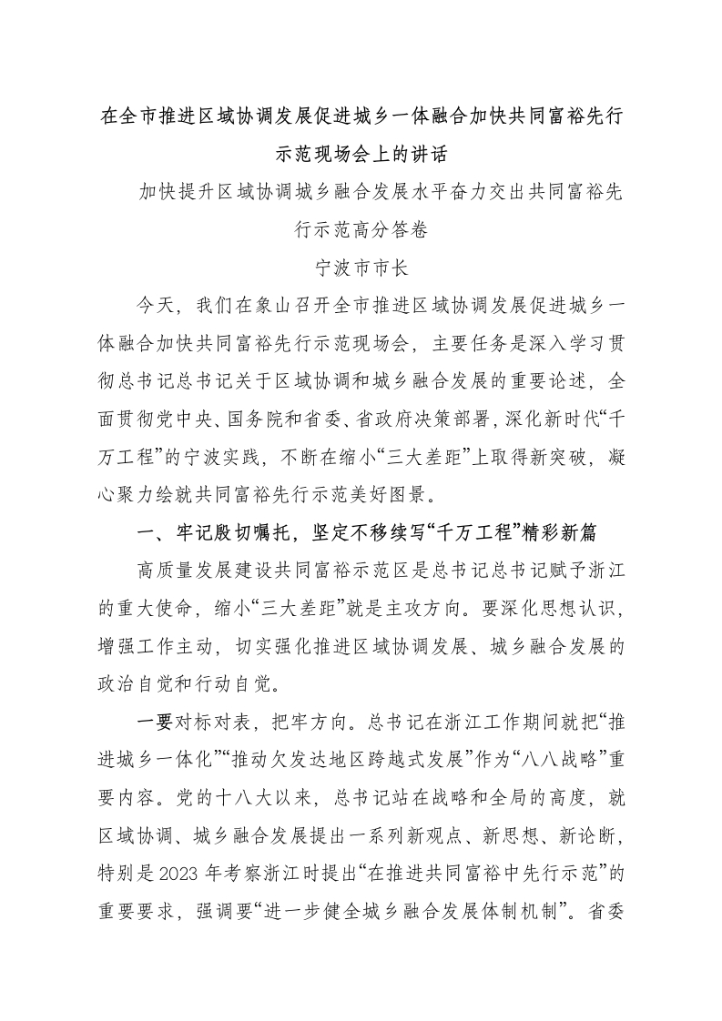 在全市推进区域协调发展促进城乡一体融合加快共同富裕先行示范现场会上的讲话加快提升区域协调城乡融合发展水平奋力交出共同富裕先行示范高分答卷宁波市市长今天,我们在象山召开全市推进区域协调发展促进城乡一体融合加快共同富裕先行示范现场会,主要任务是深入学习贯彻总书记总书记关于区域协调和城乡融合发展的重要论述,全面贯彻党中央、国务院和省委、省政府决策部署,深化新时代“千万工程”的宁波实践,不断在缩小“三大差距”上取得新突破,凝心聚力绘就共同富裕先行示范美好图景。一、牢记殷切嘱托,坚定不移续写“千万工程”精彩新篇高质量发展建设共同富裕示范区是总书记总书记赋予浙江的重大使命,缩小“三大差距”就是主攻方向。要深化思想认识,增强工作主动,切实强化推进区域协调发展、城乡融合发展的政治自觉和行动自觉。一要对标对表,把牢方向。总书记在浙江工作期间就把“推进城乡一体化”“推动欠发达地区跨越式发展”作为“八八战略”重要内容。党的十八大以来,总书记站在战略和全局的高度,就区域协调、城乡融合发展提出一系列新观点、新思想、新论断,特别是2023年考察浙江时提出“在推进共同富裕中先行示范”的重要要求,强调要“进一步健全城乡融合发展体制机制”。省委