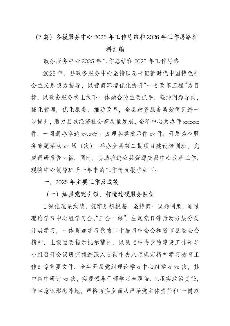 (7篇)各级服务中心2025年工作总结和2026年工作思路材料汇编政务服务中心2025年工作总结和2026年工作思路2025年,县政务服务中心坚持以总书记新时代中国特色社会主义思想为指导,以营商环境优化提升“一号改革工程”为目标,以政务服务线上线下一体融合为主要抓手,坚持问题导向,强化管理,优化服务,推动改革,全县政务服务质效得到进一步提升,助力县域经济社会高质量发展。全年中心共办件xxxx件,一网通办率达x,xx%;办理各类批示件件;开展为企服务专题活动x巡场(次);举办全县第二期项目建设培训班,完成调研报告x篇。同时,协助推进公共资源交易中心改革工作。现将中心领导班子一年来的工作情况报告如下:一、2025年主要工作及成效(一)加强党建引领,打造过硬服务队伍1.深化理论武装,筑牢思想根基。坚持第一议题制度,通过理论学习中心组学习会、“三会一课”主题党日等活动分层分类开展学习,一体贯通学习党的二十届四中全会和省市县委全会精神、上级重要指示批示精神,以及《中央党的建设工作领导小组召开会议研究推进深入贯彻中央八项规定精神学习教育工作》等重要文件。全年开展党组理论学习中心组学习x次,其中集中研讨双次,实现领导干部学习全覆盖。2.压实政治责任,守牢意识形态阵地。严格落实全面从严治党主体责任和“一岗双