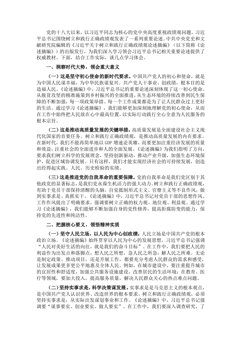 党的十八大以来,以习近平同志为核心的党中央高度重视政绩观问题,习近平总书记围绕树立和践行正确政绩观发表了一系列重要论述。中共中央党史和文献研究院编辑的《习近平关于树立和践行正确政绩观论述摘编》(以下简称《论述摘编》)的出版发行,为我们深入学习领会习近平总书记相关重要论述提供了权威教材。下面,结合工作实际,谈几点学习体会。一、洞察时代大势,领会重大意义(一)这是坚守初心使命的新时代要求。中国共产党人的初心和使命,就是为中国人民谋幸福,为中华民族谋复兴。共产党人干事业、创政绩,根本目的是造福人民。《论述摘编》中,习近平总书记的重要论述深刻体现了这一初心使命。从脱贫攻坚的精准施策到乡村振兴的全面推进,从生态环境的持续改善到民生保障的不断加强,每一项政策举措、每一个工作成果都是为了让人民群众过上更好的生活。通过学习《论述摘编》,我们能够更加深刻地理解党的初心使命,从而在工作中始终把人民放在心中最高位置,以实际行动践行全心全意为人民服务的根本宗旨。(二)这是推动高质量发展的关键举措。高质量发展是全面建设社会主义现代化国家的首要任务。树立和践行正确政绩观,是推动高质量发展的内在要求。在新时代,我们不能再简单地以GDP增速论英雄,而要更加注重经济发展的质量和效益,注重社会的全面进步和人的全面发展。《论述摘编》为我们指明了方向,要求我们树立科学的发展理念,坚持创新驱动,推动产业升级,加强生态环境保护,促进区域协调发展。只有这样,我们才能实现经济社会的可持续发展,创造出经得起实践、人民、历史检验的实绩。(三)这是推进党的自我革命的重要保障。党的自我革命是我们党区别于其他政党的显著标志,是我们党永葆生机活力的强大动力。树立和践行正确政绩观,有助于党员干部保持清醒的头脑,自觉抵制形式主义、官僚主义等不良作风,做到实事求是、真抓实干。《论述摘编》中,习近平总书记对党员干部的思想作风、工作作风提出了明确要求,强调要树立正确的权力观、地位观、利益观。通过学习《论述摘编》,我们能够不断加强自身的党性修养,提高拒腐防变的能力,保持党的先进性和纯洁性。二、把握核心要义,领悟精神实质(一)坚守人民立场,以人民为中心创政绩。人民立场是中国共产党的根本政治立场。《论述摘编》始终贯穿以人民为中心的发展思想,习近平总书记强调“人民对美好生活的向往,就是我们的奋斗目标”。在工作中,我们要把人民的利益作为出发点和落脚点,想人民之所想,急人民之所急,解人民之所难。无论是制定政策、推动项目,还是开展工作,都要充分考虑人民群众的需求和感受,让发展成果更多更公平地惠及全体人民。例如,在城市建设中,要注重提升城市的宜居性和舒适度,加强公共服务设施建设,改普居民的生活环境:在教育、医疗等领域,要加大投入,提高服务质量,解决人民群众关心的热点难点问题。(二)坚持实事求是,科学决策谋发展。实事求是是马克思主义的根本观点,是中国共产党人认识世界、改造世界的根本要求。树立和践行正确政绩观,必须坚持实事求是,从实际出发谋划事业和工作。《论述摘编》中,习近平总书记强调要“谋事要实、创业要实、做人要实”。在工作中,我们要深入调查研究,了