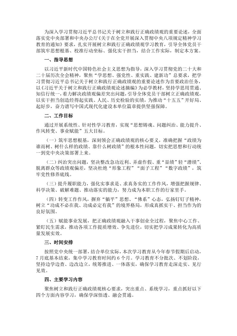 为深入学习贯彻习近平总书记关于树立和践行正确政绩观的重要论述,全面落实党中央部署和中央办公厅《关于在全党开展深入贯彻中央八项规定精神学习教育的通知》要求,扎实开展树立和践行正确政绩观学习教育,引导全体党员干部筑牢思想根基、校准行动坐标、强化实干担当,结合工作实际,制定本方案。一、指导思想以习近平新时代中国特色社会主义思想为指导,深入学习贯彻党的二十大和二十届历次全会精神,聚焦“学思想、强党性、重实践、建新功”总要求,把学习贯彻习近平总书记关于树立和践行正确政绩观的重要论述作为首要政治任务,以《习近平关于树立和践行正确政绩观论述摘编》为必学教材,坚持学思用贯通、知信行统一,着力解决政绩观偏差突出问题,引导全体党员干部树立正确政绩观,以实干担当创造经得起实践、人民、历史检验的实绩,为推动“十五五”开好局、起好步,奋力谱写中国式现代化建设本单位篇章提供坚强保障。二、工作目标通过开展系统性、针对性学习教育,实现“思想铸魂、问题纠治、能力提升、作风转变、事业赋能”五大目标。(一)筑牢思想根基,深刻领会正确政绩观的核心要义,准确把握“政绩为谁而树、树什么样的政绩、靠什么树政绩”的根本性问题,切实把思想和行动统一到党中央决策部署上来。(二)纠治突出问题,坚决整改急功近利、弄虚作假、重“显绩”轻“潜绩”、脱离群众等政绩观偏差,坚决杜绝“形象工程”“面子工程”“数字政绩”,筑牢党性修养底线。(三)提升履职能力,强化实事求是、求真务实的工作作风,增强把握规律、科学决策、破解难题、推动落实的能力,努力成为本职工作的行家里手。(四)转变工作作风,摒弃“躺平”思想、“佛系”心态,弘扬钉钉子精神,树立“功成不必在我、功成必定有我”的境界格局,形成真抓实干、担当作为的良好氛围。(五)赋能事业发展,把正确政绩观融入干事创业全过程,聚焦中心工作、紧盯民生需求,推动各项工作提质增效、争先进位,切实把学习成果转化为高质量发展实效。三、时间安排按照党中央统一部署,结合单位实际,本次学习教育从今年春节假期后启动,7月底基本结束,集中学习教育时间约6个月。学习教育不分批次、不划阶段,坚持边学边查、边改边立,统筹推进、一体落实,确保学习教育走深走实、见行见效。四、主要学习内容聚焦树立和践行正确政绩观核心要求,突出重点、系统学习,重点抓好以下四个方面内容学习,确保学深悟透、融会贯通。