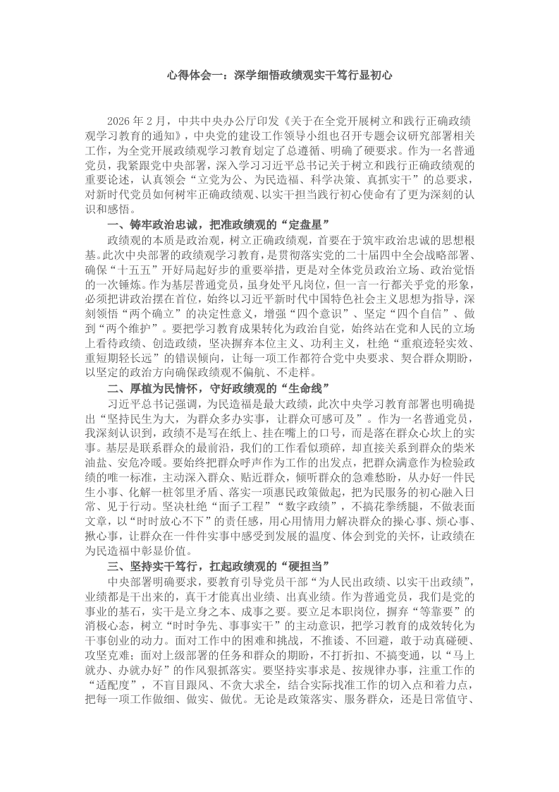 心得体会一:深学细悟政绩观实干笃行显初心2026年2月,中共中央办公厅印发《关于在全党开展树立和践行正确政绩观学习教育的通知》,中央党的建设工作领导小组也召开专题会议研究部署相关工作,为全党开展政绩观学习教育划定了总遵循、明确了硬要求。作为一名普通党员,我紧跟党中央部署,深入学习习近平总书记关于树立和践行正确政绩观的重要论述,认真领会“立党为公、为民造福、科学决策、真抓实干”的总要求,对新时代党员如何树牢正确政绩观、以实干担当践行初心使命有了更为深刻的认识和感悟。一、铸牢政治忠诚,把准政绩观的“定盘星”政绩观的本质是政治观,树立正确政绩观,首要在于筑牢政治忠诚的思想根基。此次中央部署的政绩观学习教育,是贯彻落实党的二十届四中全会战略部署、确保“十五五”开好局起好步的重要举措,更是对全体党员政治立场、政治觉悟的一次锤炼。作为基层普通党员,虽身处平凡岗位,但一言一行都关乎党的形象,必须把讲政治摆在首位,始终以习近平新时代中国特色社会主义思想为指导,深刻领悟“两个确立”的决定性意义,增强“四个意识”、坚定“四个自信”、做到“两个维护”。要把学习教育成果转化为政治自觉,始终站在党和人民的立场上看待政绩、创造政绩,坚决摒弃本位主义、功利主义,杜绝“重痕迹轻实效、重短期轻长远”的错误倾向,让每一项工作都符合党中央要求、契合群众期盼,以坚定的政治方向确保政绩观不偏航、不走样。二、厚植为民情怀,守好政绩观的“生命线”习近平总书记强调,为民造福是最大政绩,此次中央学习教育部署也明确提出“坚持民生为大,为群众多办实事,让群众可感可及”。作为一名普通党员,我深刻认识到,政绩不是写在纸上、挂在嘴上的口号,而是落在群众心坎上的实事。基层是联系群众的最前沿,我们的工作看似琐碎,却直接关系到群众的柴米油盐、安危冷暖。要始终把群众呼声作为工作的出发点,把群众满意作为检验政绩的唯一标准,主动深入群众、贴近群众,倾听群众的急难愁盼,从办好一件民生小事、化解一桩邻里矛盾、落实一项惠民政策做起,把为民服务的初心融入日常、见于行动。坚决杜绝“面子工程”“数字政绩”,不搞花拳绣腿,不做表面文章,以“时时放心不下”的责任感,用心用情用力解决群众的操心事、烦心事、揪心事,让群众在一件件实事中感受到发展的温度、体会到党的关怀,让政绩在为民造福中彰显价值。三、坚持实干笃行,扛起政绩观的“硬担当”中央部署明确要求,要教育引导党员干部“为人民出政绩、以实干出政绩”,业绩都是干出来的,真干才能真出业绩、出真业绩。作为普通党员,我们是党的事业的基石,实干是立身之本、成事之要。要立足本职岗位,摒弃“等靠要”的消极心态,树立“时时争先、事事实干”的主动意识,把学习教育的成效转化为干事创业的动力。面对工作中的困难和挑战,不推诿、不回避,敢于动真碰硬、攻坚克难:面对上级部署的任务和群众的期盼,不打折扣、不搞变通,以“马上就办、办就办好”的作风狠抓落实。要坚持实事求是、按规律办事,注重工作的“适配度”,不盲目跟风、不贪大求全,结合实际找准工作的切入点和着力点,把每一项工作做细、做实、做优。无论是政策落实、服务群众,还是日常值守、