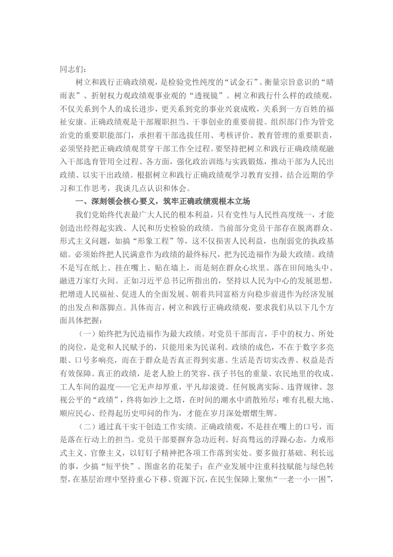 同志们:树立和践行正确政绩观,是检验党性纯度的“试金石”、衡量宗旨意识的“晴雨表”、折射权力观政绩观事业观的“透视镜”。树立和践行什么样的政绩观,不仅关系到个人的成长进步,更关系到党的事业兴衰成败,关系到一方百姓的福祉安康。正确政绩观是干部履职担当、干事创业的重要前提。组织部门作为管党治党的重要职能部门,承担着干部选拔任用、考核评价、教育管理的重要职责,必须坚持把正确政绩观贯穿干部工作全过程。要坚持把树立和践行正确政绩观融入干部选育管用全过程、各方面,强化政治训练与实践锻炼,推动干部为人民出政绩、以实干出政绩。根据树立和践行正确政绩观学习教育安排,结合近期的学习和工作思考,我谈几点认识和体会。一、深刻领会核心要义,筑牢正确政绩观根本立场我们党始终代表最广大人民的根本利益,只有党性与人民性高度统一,才能创造出经得起实践、人民和历史检验的政绩。当前部分党员干部存在脱离群众、形式主义问题,如搞“形象工程”等,这不仅损害人民利益,也削弱党的执政基础。必须始终把人民满意作为政绩的最终标尺,把为民造福作为最大政绩。政绩不是写在纸上、挂在嘴上、贴在墙上,而是刻在群众心坎里、落在田间地头中、融进万家灯火间。正如习近平总书记所指出的,坚持以人民为中心的发展思想,把增进人民福祉、促进人的全面发展、朝着共同富裕方向稳步前进作为经济发展的出发点和落脚点。具体而言,树立和践行正确政绩观,要求我们从以下几个方面具体把握:(一)始终把为民造福作为最大政绩。对党员干部而言,手中的权力、所处的岗位,是党和人民赋予的,只能用来为民谋利。政绩的成色,不在于数字多亮眼、口号多响亮,而在于群众是否真正得到实惠、生活是否切实改善、权益是否有效保障。真正的政绩,是老人脸上的笑容、孩子书包的重量、农民地里的收成、工人车间的温度一一它无声却厚重,平凡却滚烫。任何脱离实际、违背规律、忽视公平的“政绩”,终将如沙上之塔,在时间的潮水中消散殆尽:唯有扎根大地、顺应民心、经得起历史叩问的作为,才能在岁月深处熠熠生辉。(二)通过真干实干创造工作实绩。正确政绩观,不是挂在嘴上的口号,而是落在行动上的担当。党员干部要摒弃急功近利、好高骛远的浮躁心态,力戒形式主义、官僚主义,以钉钉子精神把各项工作落到实处。要多做打基础、利长远的事,少搞“短平快”、图虚名的花架子:在产业发展中注重科技赋能与绿色转型,在基层治理中坚持重心下移、资源下沉,在民生保障上聚焦“一老一小一困”,