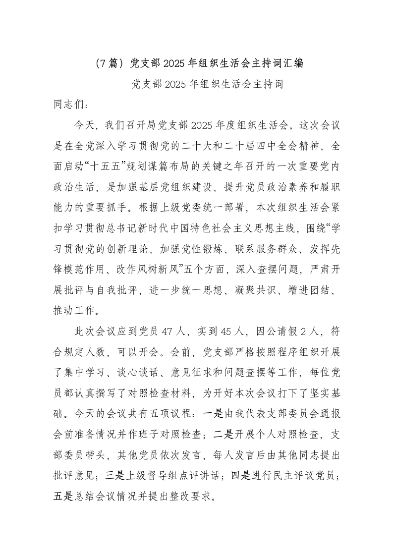 (7篇)党支部2025年组织生活会主持词汇编党支部2025年组织生活会主持词同志们:今天,我们召开局党支部2025年度组织生活会。这次会议是在全党深入学习贯彻党的二十大和二十届四中全会精神、全面启动“十五五”规划谋篇布局的关键之年召开的一次重要党内政治生活,是加强基层党组织建设、提升党员政治素养和履职能力的重要抓手。根据上级党委统一部署,本次组织生活会紧扣学习贯彻总书记新时代中国特色社会主义思想主线,围绕“学习贯彻党的创新理论、加强党性锻炼、联系服务群众、发挥先锋模范作用、改作风树新风”五个方面,深入查摆问题,严肃开展批评与自我批评,进一步统一思想、凝聚共识、增进团结、推动工作。此次会议应到党员47人,实到45人,因公请假2人,符合规定人数,可以开会。会前,党支部严格按照程序组织开展了集中学习、谈心谈话、意见征求和问题查摆等工作,每位党员都认真撰写了对照检查材料,为开好本次会议打下了坚实基础。今天的会议共有五项议程:一是由我代表支部委员会通报会前准备情况并作班子对照检查;二是开展个人对照检查,支部委员带头,其他党员依次发言,每人发言后由其他同志提出批评意见;三是上级督导组点评讲话;四是进行民主评议党员;五是总结会议情况并提出整改要求。
