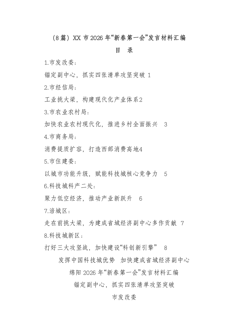 (8篇)X市2026年“新春第一会”发言材料汇编目录1.市发改委:锚定副中心,抓实四张清单攻坚突破12.市经信局:工业挑大梁,构建现代化产业体系23.市农业农村局:加快农业农村现代化,推进乡村全面振兴34.市商务局:消费提质扩容,打造西部消费高地45.市住建委:以城市功能升级,赋能科技城核心竞争力56科技城科产二处:聚力低空经济,推动产业新跃升67.涪城区:走在前挑大梁,为建成省域经济副中心多作贡献78.科技城新区:打好三大攻坚战,加快建设“科创新引擎”8发挥中国科技城优势加快建成省域经济副中心绵阳2026年“新春第一会”发言材料汇编锚定副中心,抓实四张清单攻坚突破市发改委