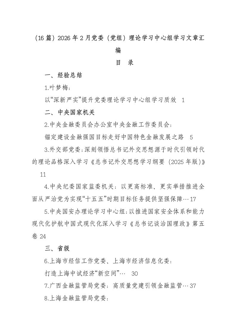 (16篇)2026年2月党委(党组)理论学习中心组学习文章汇编目录一、经验总结1.叶梦梅:以“深新严实”提升党委理论学习中心组学习质效1二、中央国家机关2.中央金融委员会办公室中央金融工作委员会:锚定建设金融强国目标走好中国特色金融发展之路53.外交部党委:深刻领悟总书记外交思想源于时代引领时代的理论品格深入学习《总书记外交思想学习纲要(2025年版)》114.中央纪委国家监委机关:以更高标准、更实举措推进全面从严治党为实现“十五五”时期目标任务提供坚强保障…175.中央国安办理论学习中心组:以推进国家安全体系和能力现代化护航中国式现代化深入学习《总书记谈治国理政》第五卷24三、省级6.上海市经信工作党委、上海市经济信息化委:打造上海中试经济“新空间”…307.广西金融监管局党委:高质量党建引领金融监管…378.上海金融监管局党委: