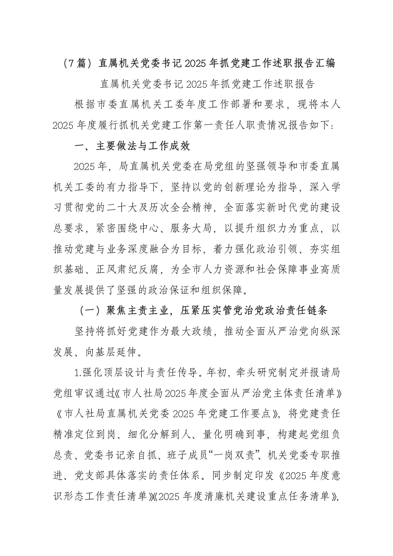 (7篇)直属机关党委书记2025年抓党建工作述职报告汇编直属机关党委书记2025年抓党建工作述职报告根据市委直属机关工委年度工作部署和要求,现将本人2025年度履行抓机关党建工作第一责任人职责情况报告如下:一、主要做法与工作成效2025年,局直属机关党委在局党组的坚强领导和市委直属机关工委的有力指导下,坚持以党的创新理论为指导,深入学习贯彻党的二十大及历次全会精神,全面落实新时代党的建设总要求,紧密围绕中心、服务大局,以提升组织力为重点,以推动党建与业务深度融合为目标,着力强化政治引领、夯实组织基础、正风肃纪反腐,为全市人力资源和社会保障事业高质量发展提供了坚强的政治保证和组织保障。(一)聚焦主责主业,压紧压实管党治党政治责任链条坚持将抓好党建作为最大政绩,推动全面从严治党向纵深发展、向基层延伸。1.强化顶层设计与责任传导。年初,牵头研究制定并报请局党组审议通过《市人社局2025年度全面从严治党主体责任清单》《市人社局直属机关党委2025年党建工作要点》,将党建责任精准定位到岗、细化分解到人、量化明确到事,构建起党组负总责、党委书记亲自抓、班子成员“一岗双责”机关党委专职推进、党支部具体落实的责任体系。同步制定印发《2025年度意识形态工作责任清单X2025年度清廉机关建设重点任务清单》,